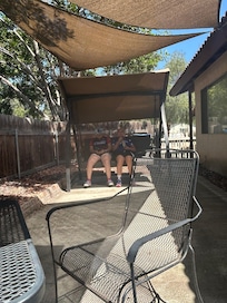 This is a spacious, well lit, convenient Bungalow. There is a King Bed in the bedroom with a Queen Murphy bed in the unit. The kitchen is new with stainless steel appliances. There are 4 skylights with great natural lighting and a whole house ventilation fan in addition to the air conditioning, There are two large flat screen TVs and free WiFi. There is a large tree shaded patio with table, chairs, swing and a grill for your enjoyment. There is a great work area with a large desk and shelves for easy workability.