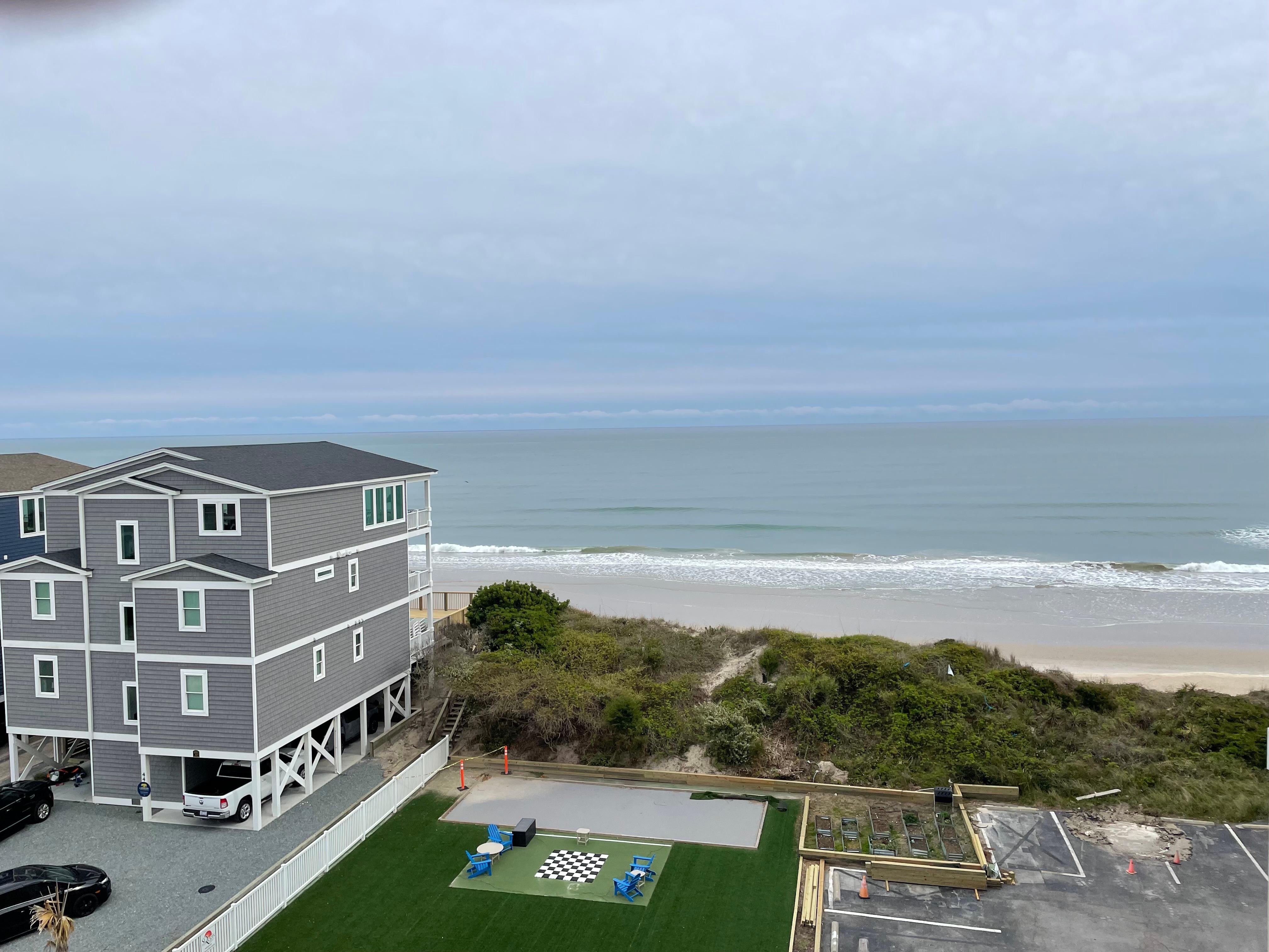Let the sparkling ocean views wow you when you book this affordable, beachfront condo in North Topsail Beach, NC! Admire said views from your private balcony, which also overlooks the tennis court available. Speaking of incredible community amenities, you and your loved ones will have access to the resort's family-friendly amenities, which include an outdoor pool with access to Bum's Cabana Grill that services lunch and drinks, a new arcade, basketball court, shuffleboard, a workout facility with a sauna, a new children's playground, and BBQ grills in the courtyard. The condo has an inviting living/dining area with two comfortable sofas, a TV, and a six-person dining table. Prepare delicious beach snacks and meals for the group in the well-appointed kitchen, complete with a full-size fridge, stove, oven, dishwasher, microwave, electric oven, toaster, and coffee maker. The wet bar next to the kitchen allows you to surprise your guests with refreshing and sweet cocktails and mocktails during your stay.