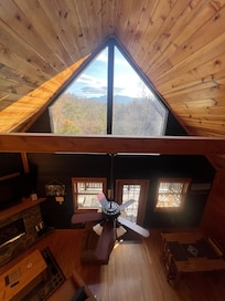 Located in the spacious loft near the king bed, the romantic couples jacuzzi tub offers a peaceful place to unwind while enjoying warm lighting and mountain ambiance—perfect for honeymooners or a cozy retreat for two.