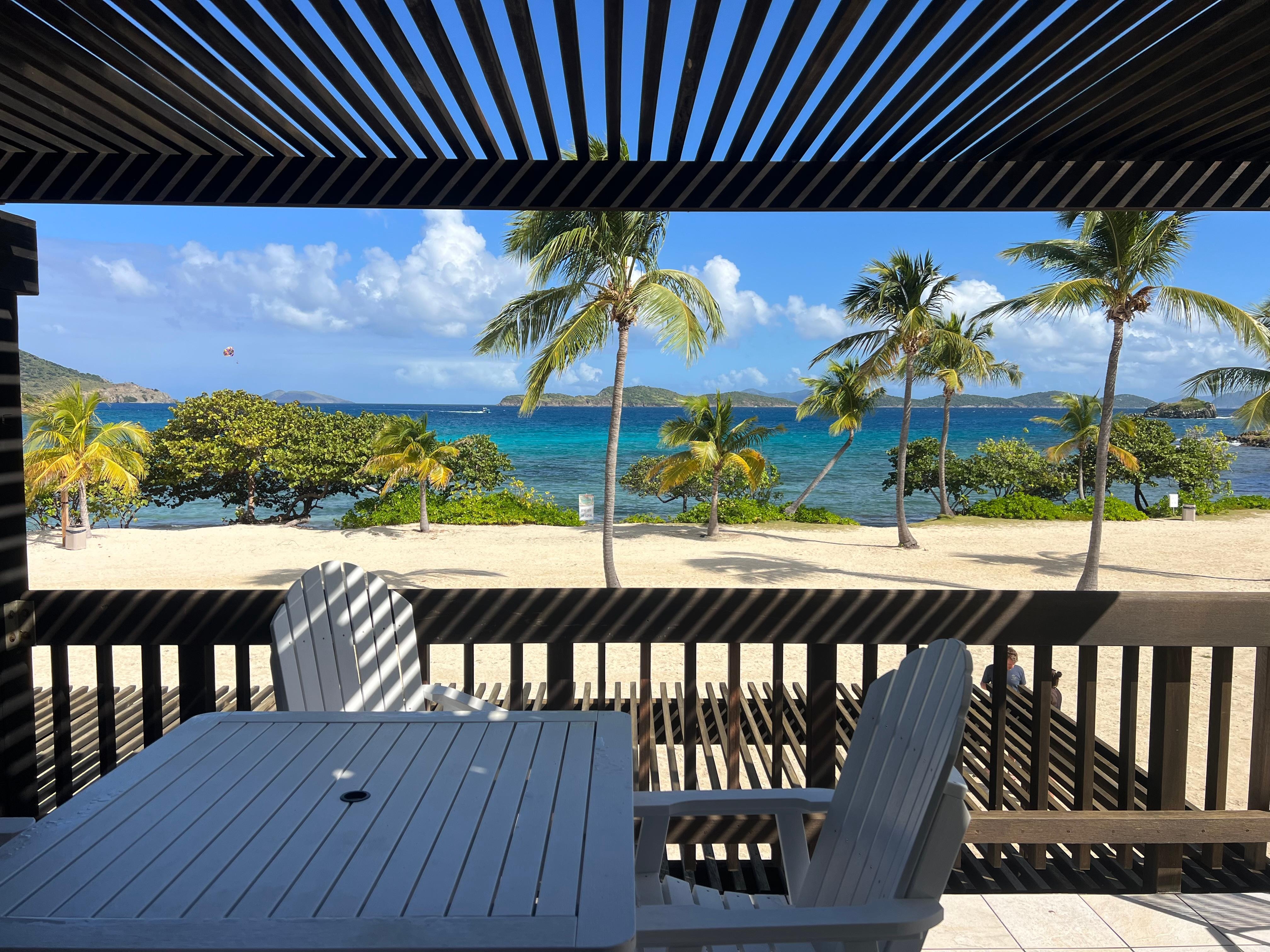Incredible views of Sapphire Beach! Corner unit, 2nd floor privacy, Keyless entry! We also own the unit (beachfront) below it so if you need additional accommodations due to wedding, family reunion or traveling with friends, please check out our other VRBO listing #720774. Completely remodeled August, 2019 - Floor to ceiling! Included are chaise lounges, table & chairs, appliances, new 2019 dishwasher, high-speed WIFI included, 2 sets of snorkeling gear, King Bed that is super comfortable, all new amenities, blender, coffee maker, hair dryer, (1) large flat screen TV, air conditioning & 2 new ceiling fans; double sliding glass doors that open onto the deck; umbrellas, beach towels & amazing sunrises included. The rates quoted are for two guests ONLY.