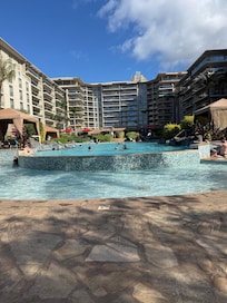 •Five distinct pool experiences, family lagoon, grotto with waterfalls, 100-ft waterslide, lazy river, and a relaxation/quiet pool, all with adjacent hot tubs