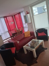 The large, bright living area with south orientation, the terrace with wooden furniture, large umbrella and lounger including the sound of the sea will relax you wonderfully.