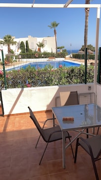 Esta casa adosada de con vistas al mar se beneficia de una hermosa piscina grande. Dormitorio principal con acceso directo a una espectacular terraza en la azotea con vistas panorámicas al mar. Segunda y tercera habitaciones qué están bastante pequeño con una cama individual y una cama suplementaria en cada uno. Suelo y 1 ª planta baños. Amplio salón con comedor amueblado con un cómodo sofá y sillón. TV de pantalla plana de 32 pulgadas y DVD con estaciones inglesas y españolas. Las puertas del patio conducen a la terraza frontal que tiene un hermoso comedor de granito con un toldo retráctil para dar sombra cuando sea necesario. Cocina totalmente equipada con horno, vitrocerámica, nevera / congelador, microondas lavadora y lavavajillas. La casa está a menos de 2 minutos a pie de la playa, cafés locales, bares, restaurantes, supermercados y las tiendas de Mojacar Playa. Con una posición elevada tendrá vistas ininterrumpidas al mar, sin embargo, es encantador y tranquilo. Ideal para familias.