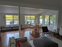 This sun-filled, modern home is directly on Long Meadow Pond--a lovely, quiet freshwater lake. Enjoy beautiful views all day long from this light-filled home.