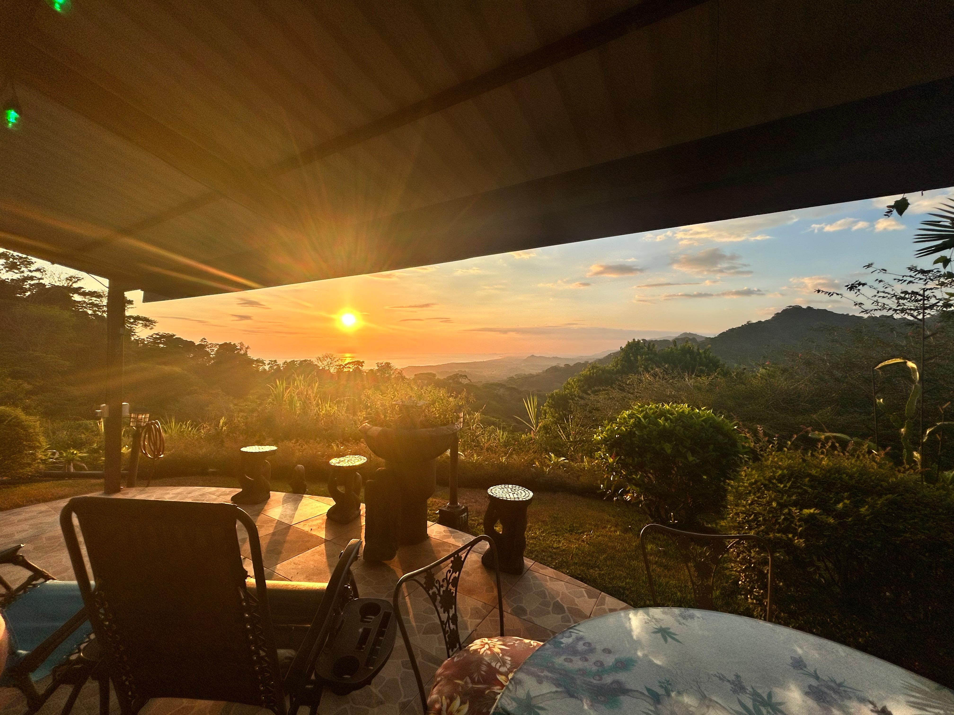 The rental property is located on the second floor of the villa and can be accessed either through the main entrance or through its own private entrance. It has two bedrooms , king beds with private balconies and adjacent bathrooms, it has a nice island combo kitchen for your cooking convenience (fridge/stove/micro-wave) with a nice eating area on a nice Guanacaste table and benches and large granite counter area on the isla to prepare the food , nice cedar cupboards and a large living Den area with a flat screen TV, and a nice 54 " pull sofa bed which can sleep an additional person or two childrens . There is an exterior rancho 15 x 15 for dining with a gas BBQ grill and seating area that can be accessed via a metal bridge from one of the bedroom balconies. Dine with spectacular views of amazing sunsets, relax with a good book or watch the abundant wildlife (monkeys, sloths, lizards, toucans, hummingbirds ,butterflies ,etc.).