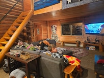 La planta baja se define por un techo de lengüeta y surco con vigas de madera y paredes con paneles de madera para cumplir con el tema de la cabina. Relájate y relájate en la sala de estar en el cómodo sofá seccional. ¡Encienda la televisión por cable de pantalla plana de 55 "montada o tome una nueva lectura de la estantería!