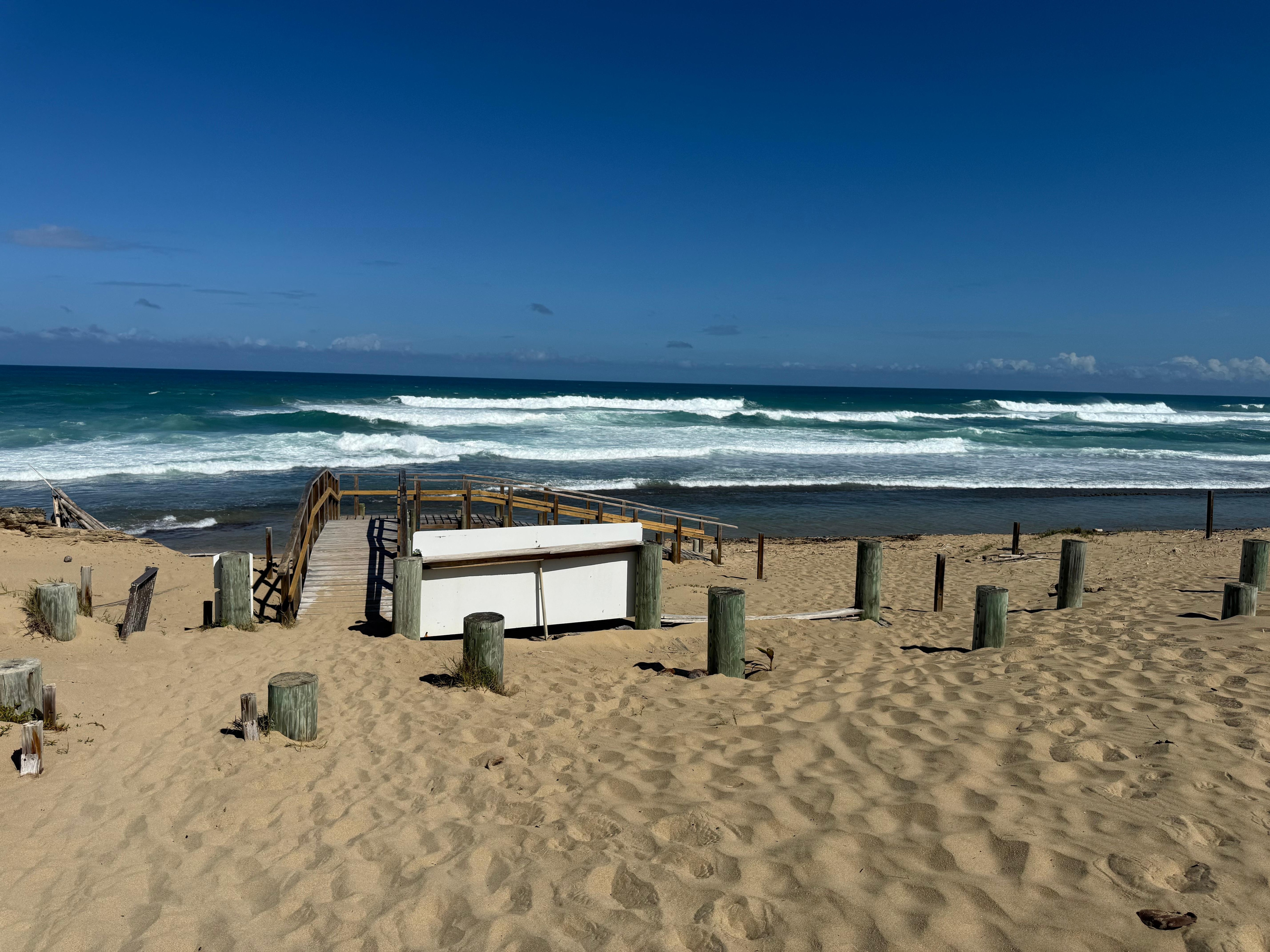 The boardwalk in front of the Complex is no longer available. The Beach is accessible through the wood bridge in the center of what was the boardwalk. Currently, the tennis court is not in service.