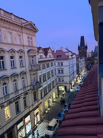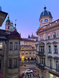 Appartement entièrement aménagé et entièrement rénové situé au 5ème étage d'un immeuble de 6 étages offrant une vue luxueuse depuis les deux balcons • un balcon privé • un balcon commun, en particulier la nuit lorsque vous pouvez voir le château de Prague illuminé.