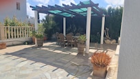 Location and a great pool area are key benefits of this genuinely luxury and spacious villa inside and out. A large private walk-in swimming pool (9m x 4.5m, most pools in area are 8mx4m) with great and spacious sunbathing areas and comfortable sun lounges. Benefits from having the sun all day long around the pool as well as 3 separate dining areas in the sun, shaded outside or indoors. We have many returning guests which we think reflects the service and location we offer. Water system is pressurised. Only a few minutes walk to the restaurants , shops and amenities it boasts a quiet position too. We personally visit the property 4/5 times a year and are continually updating it for the enjoyment of our customers, Gardens are beautifully landscaped and well lit and can be enjoyed in the evening while relaxing on the balcony or veranda, better still whilst eating under the stars beneath the extensive pergola. The barbecue and outside fridge make al fresco dining a desirable alternative to the many excellent restaurants in the village and surrounding areas. 6 person Jacuzzi (optional addition) a must for evening relaxing. Mountain and Sea views. Located in a private exclusive cud-de-sac just a short walk to Coral Bay village. All bedrooms are ensuite. The moment you walk through the door you will feel relaxed. The villa offers real comforts of home having spacious rooms that are superbly decorated with quality furnishings and air conditioning is throughout. 5 minutes walk will take you to the sea and 10 - 12 minutes walk to the main beach with all facilities. Electricity is included.