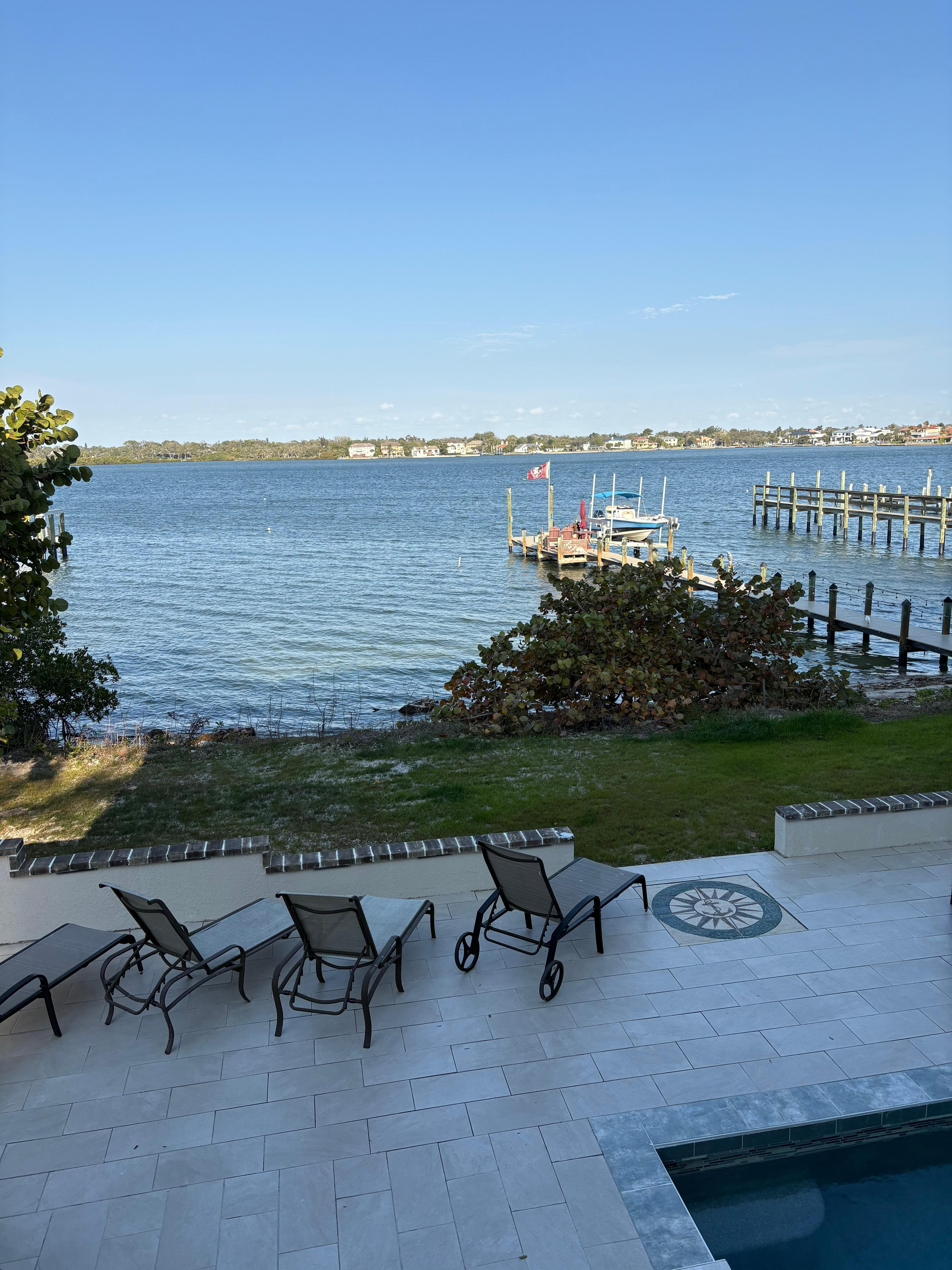Extremely Private: -inspired elegant decor welcomes you to this secluded tropical getaway and makes you feel at home with a 120-foot-long boat dock directly on Little Sarasota Bay with plenty of dolphin and manatee activity. You won't even realize you are minutes away from a bustling city since the house sits back far from the road, you won't even hear the cars on the way to the beach, but you will hear the boats from the dock. Steps from the beach, complete with all the modern amenities and comforts of home, including a complete kitchen including a gas stove and new appliances, coffee bar, pantry and seating for 10. Outside you will find an amazing kitchen with grill, kitchen necessaties and a table seating 8 with sofa, wood fireplace and large screen tv. There are three bedrooms each with king mattresses ( two are master bedrroms). Each bedroom has their own bathroom. Extra bunk beds can be added with notice. Each bedroom has a smart Samsung large wall mounted tv. (12 person maximum) linens, and ceiling fans included in each bedroom. The family room comforatable seats 6-8 with a large tv. There are five (5) Samsung flat screen cable TVs and WIFI internet access, garage, three living levels with elevator, heated spa and pool overlooking bay, 120-foot fishing dock with underwater snook lights on the bay for best night fishing, yoga room with fitness equipment, free (2) bike - one is electric/ (2) kayak usage, (3) Stand Up Paddleboard (SUP) outdoor fireplace, horseshoes, lounge chairs, and two sets of washer/dryers.