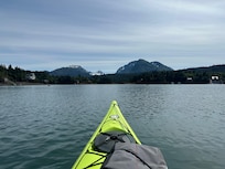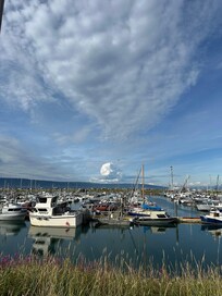The thing we love most about the cabin is the view. It also is a beautiful, lovely cabin only minutes away from downtown Homer. The cabin is beautifully decorated and well constructed. We love it that we are close to Homer, yet we often see wildlife on a daily basis.