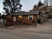 Full kitchen with dinette set, equipped with a stove, refrigerator, dishwasher, microwave, coffee pot, blender and toaster. Great rock outcroppings and view from above is created by an irregular shaped lot. Great location in town, close to Lake Estes and just minutes away from the Rocky Mountain National Park.
