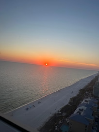 This condo overlooks the west swimming pool and hot tub with panoramic views of the Gulf and Panama City Beach. Here you're not looking straight out at the Gulf, as do most of the Tidewater condos, so you can see several thousand feet of surf along the beach and watch spectacular sunsets from every room in this home.