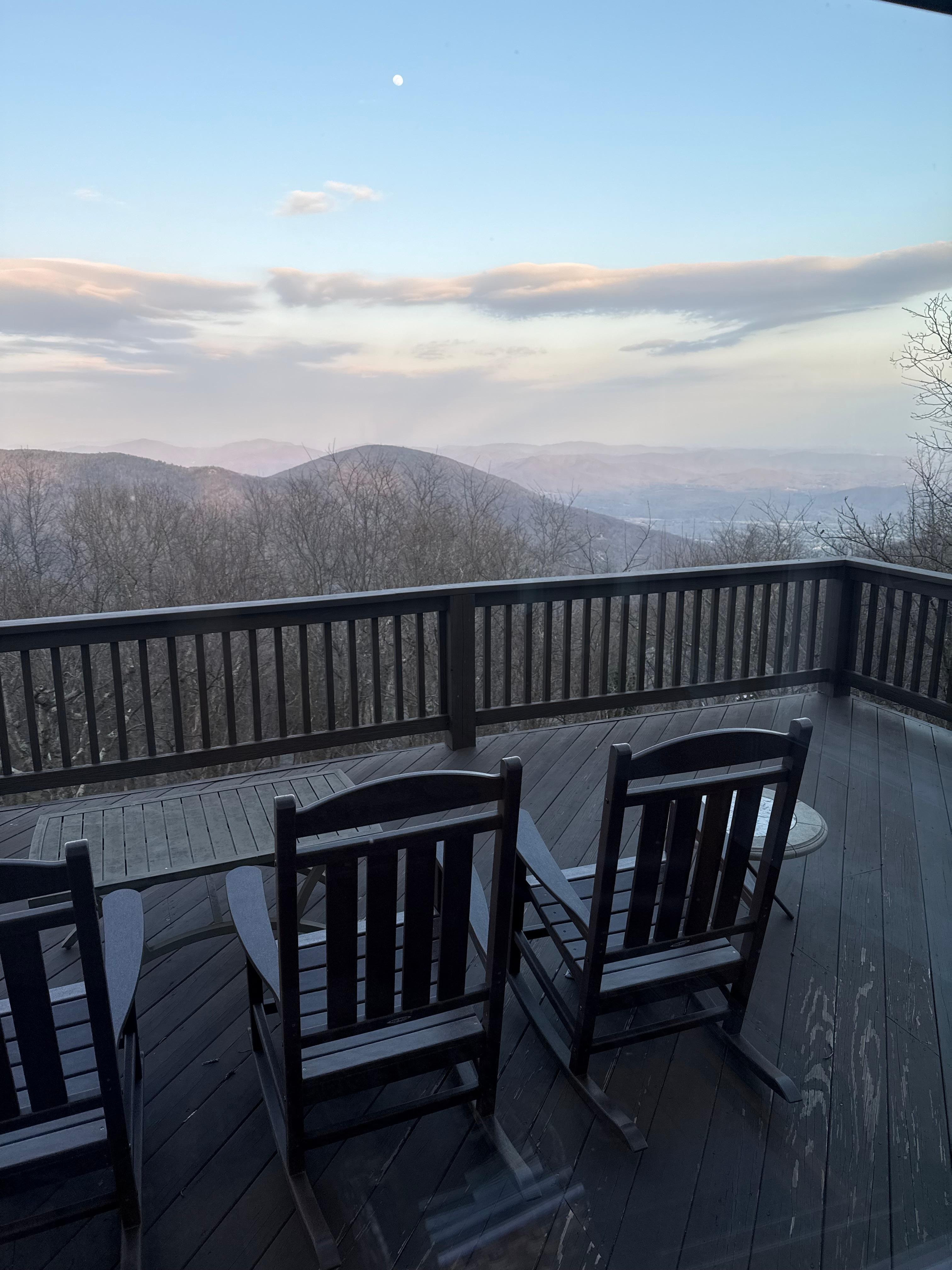 Mellemniveauet indeholder en rummelig, komfortabel stue med lædersofa og stole flankerende en brændeovn, læsning / fugle-stole, tv og wetbar. Hvelvede lofter, gulv til loft vinduer og glidende glasdøre åbner op på en afskærmet veranda og et dæk med skønhed i Blue Ridge Mountains ud over. Oplev din indre kok i vores nyligt renoverede, velindrettede køkken (kaffemaskine er en Keurig - bedes du planlægge i overensstemmelse hermed) og nyd dine kulinariske kreationer opstignet over træbjælken omkring det fuldt møblerede bagdæk ... eller fra vores 8-personers komfort spisebord.