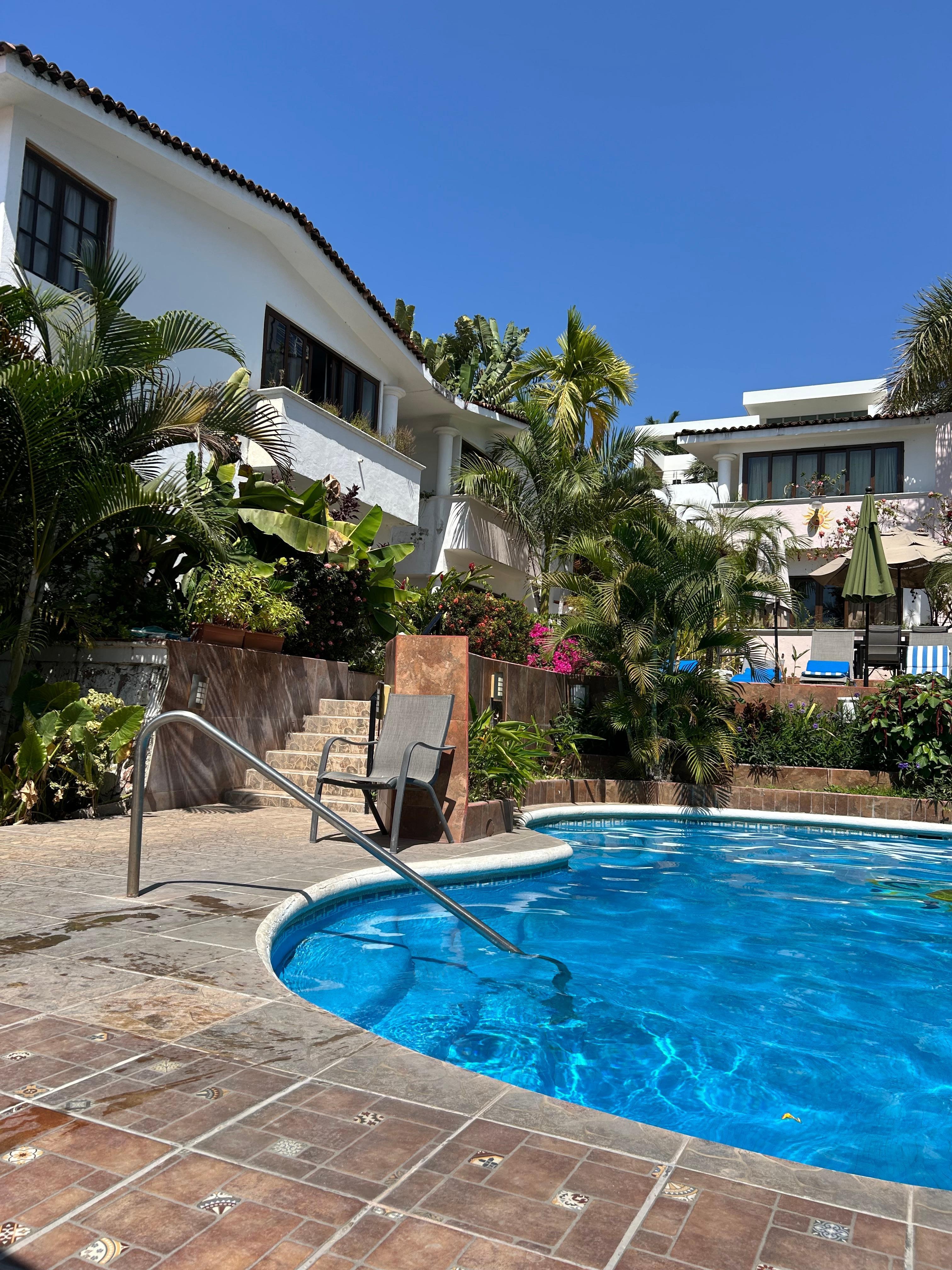 Dette er et smukt to-værelses to badeværelser, gratis med Wi-Fi og shaw satellit-tv, med i huset restaurant og bar med roomservice, ugentlig rengøring Inkluder, dette er det lille 8 condo-kompleks med smuk gårdhave og den opvarmede pool i byen Bucerias med Long Beach, gode andre restauranter og barer og shopping. Vi har en taxaholdeplads i slutningen af gaden plus det er en helt gåbar by