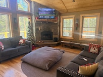 Kom slap af ved bålet og nyd at kigge ud gennem de mange vinduer og være omgivet af intet andet end træer eller måske lejlighedsvis elg, hjort eller elg. Brug lidt tid på at spise dine måltider omkring et stort regenereret træbord på den overdækkede veranda eller trængse rundt om køkkenøen, mens måltiderne tilberedes.