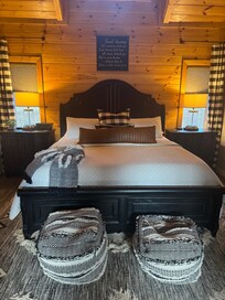 The cabin features 1 King bedroom and 1 Queen memory foam sofa sleeper. All beds feature premium linens and luxury mattresses.