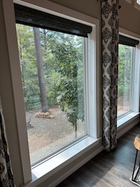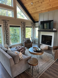 As you transition into the living room, prepare to be captivated by the surreal beauty of nature framed by large windows beneath vaulted ceilings, offering breathtaking views. The living space, adorned with upscale décor, features an American Leather sectional with the most comfortable Queen memory foam sleeper, ensuring relaxation and rest are never compromised. At the heart of this inviting room lies a gas fireplace and a smart TV, creating the perfect ambiance for cozy evenings in. 'Dream a Little Dream' marries the beauty of the outdoors with the comfort of modern luxury, making every moment inside this cabin an unforgettable experience.