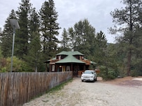 This is a remodeled three level, four bedroom house with three bathrooms (one on each floor), and private balconies off the bedrooms upstairs. The cabin is spacious with modern conveniences. The kitchen is well stocked and ready to cook for large gatherings. The setting is private with a large deck off the dining room, and a wrap-around covered porch. The bedroom on the main floor has a queen bed and private covered porch. The lower floor has two double beds and a full bathroom. The upper floor has 2 bedrooms, one with a queen and a single bed, and two balconies; the other bedroom has a double bed and balcony.