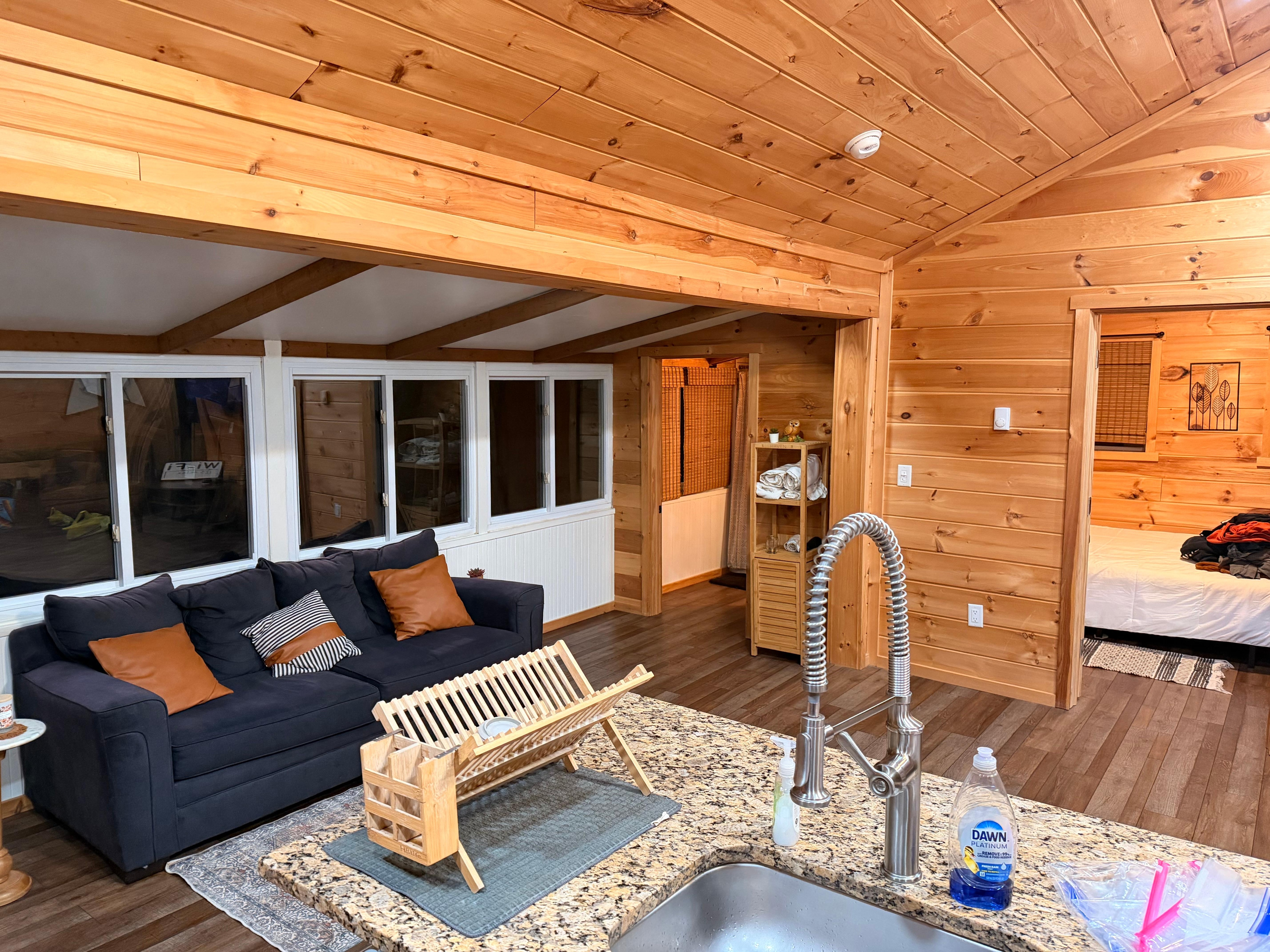 I personally love spending time at our cabin. It has amazing lighting and views and is very open and airy. The street our cabin is situated on is private and rarely traveled. It's quiet and a great place to decompress and reconnect with nature.