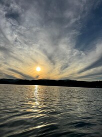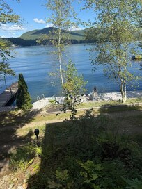 Kabinen: Kabinen blev bygget i 1930'erne. Det er meget dejligt og omgivet af skov gemt ind i siden af bakken. Kabinen er placeret på den samme ejendom som ejerne hjem. Indkørslen er delte, men den anlægsgartneri meget pænt adskiller de to. Du har din egen private swimming område. Det er skovbevokset på hver side af svømme-området (ingen har en strand eller svømme område lige ved siden af dig). Udsigten fra screenet i våbenhuset er breath taking. Du kan se op søen, øerne og solnedgange.