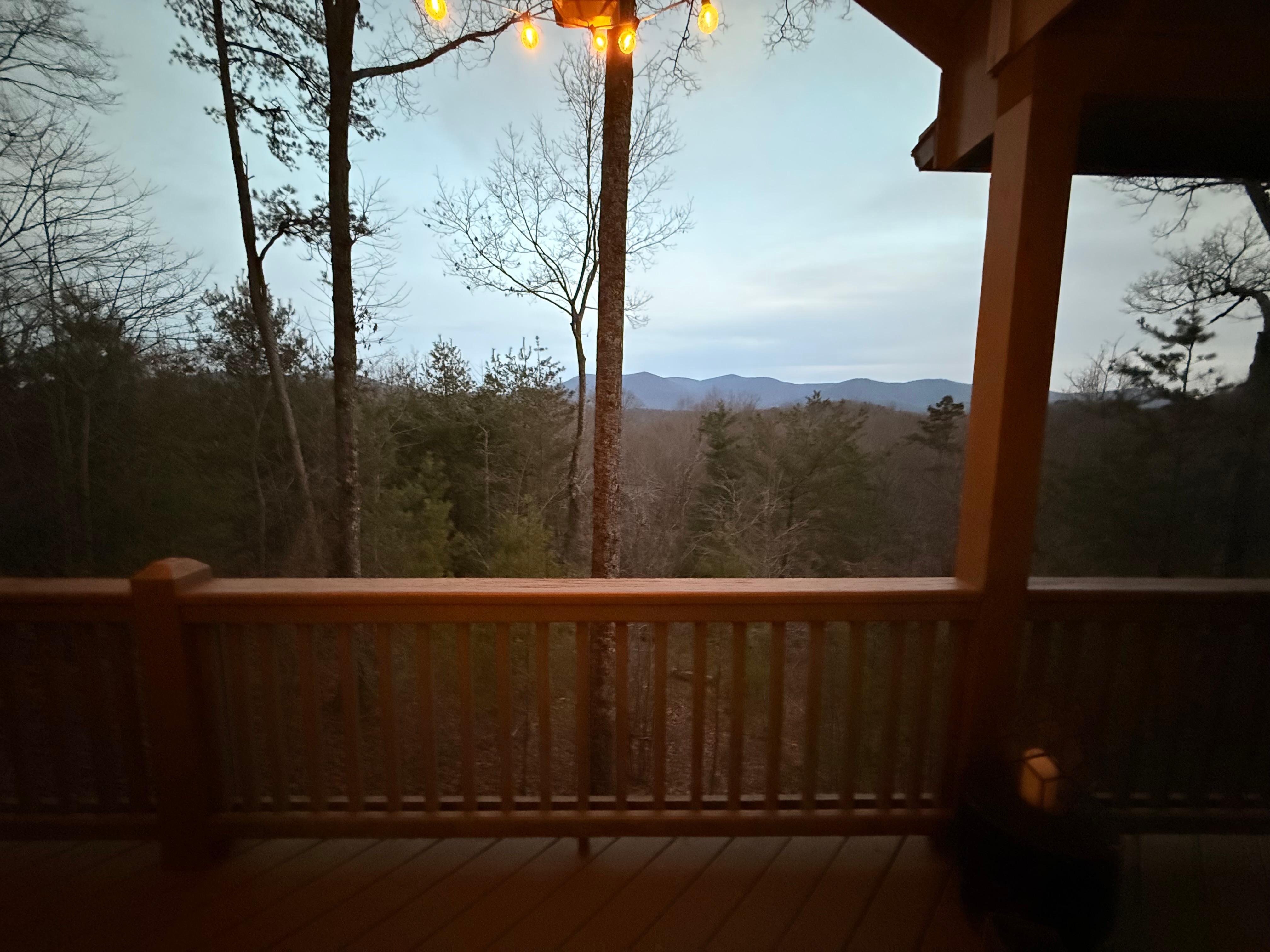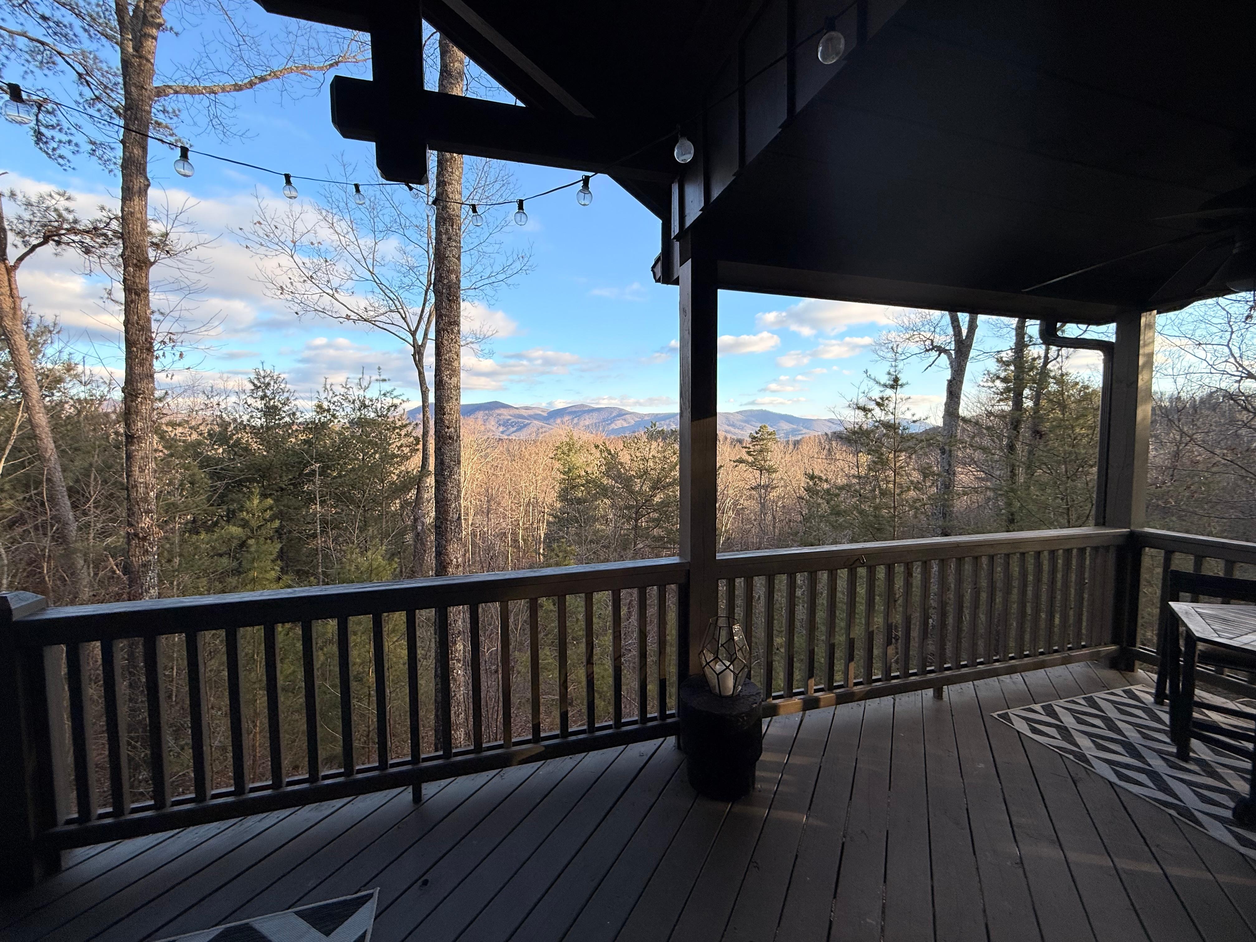 The 37 ft covered back deck features a new Hot Tub with privacy curtains for seclusion. There’s a set of rocking chairs to sip on coffee or wine while overlooking the mountains, a dining table, hammock, ceiling fans, and string lights.