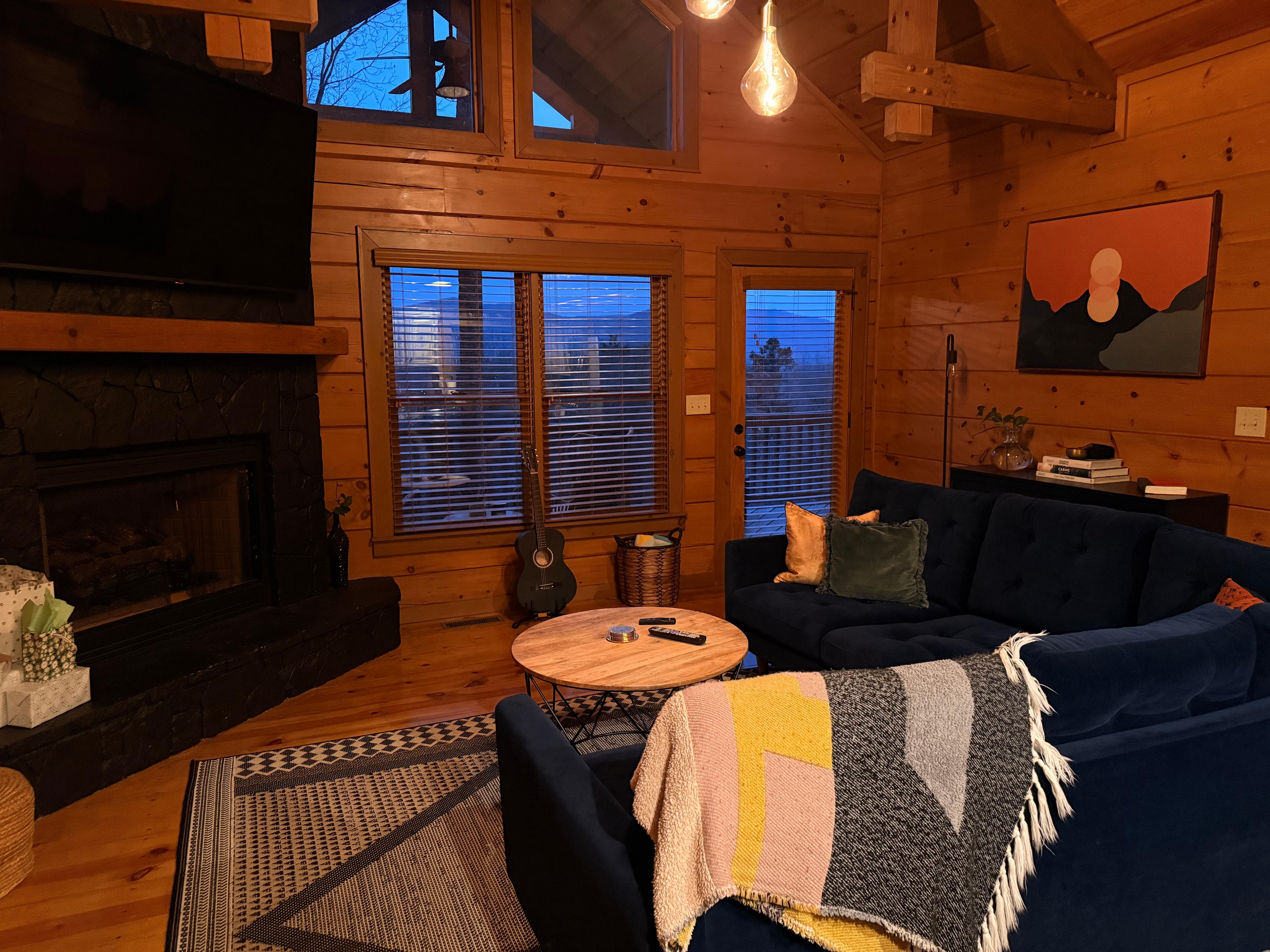 The living room features 17ft cathedral ceilings with the best Mountain Views from the blue velvet sectional couch in front of the indoor gas fireplace. There’s a 65” Smart TV in the living room fully equipped with all of the streaming applications.