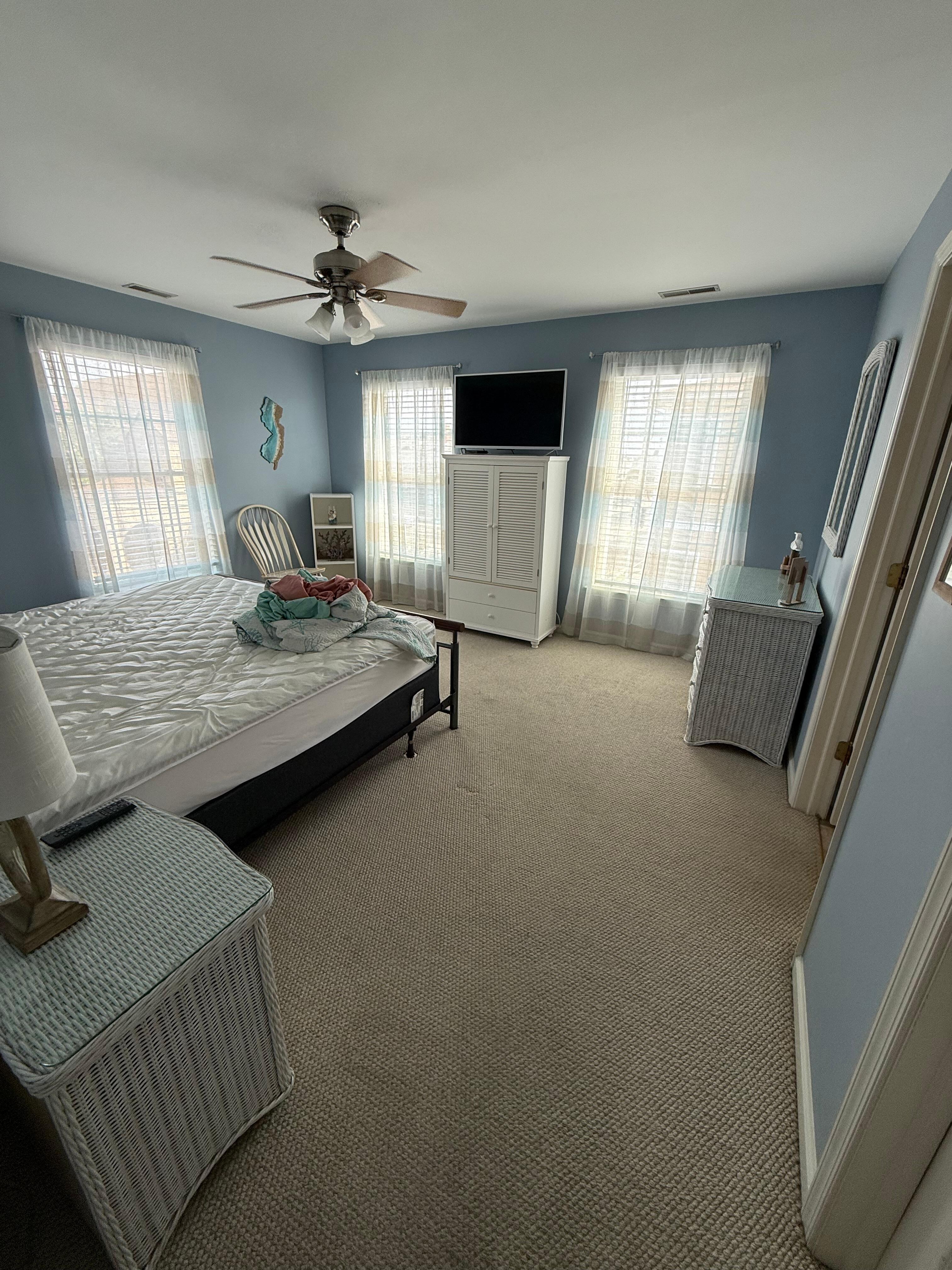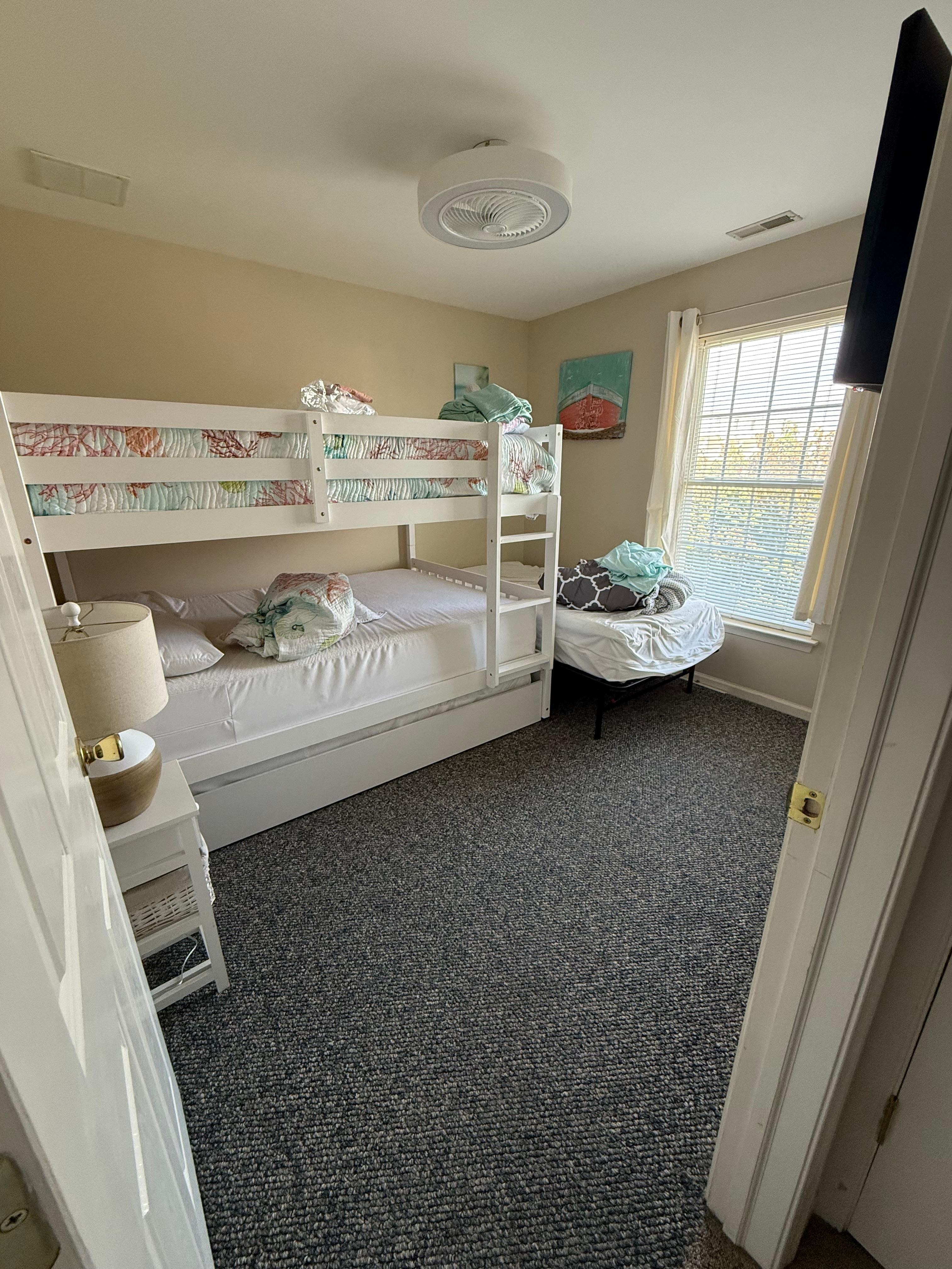 Enjoy free wireless internet, Xfinity cable, or login to your streaming service on the 60" Smart TV in living room and smart TVs in every bedroom. The master bedroom has a king size bed with private full bathroom, second bedroom a queen size bed, third bedroom has a full over full bunk bed with a twin trundle bed underneath. Extra twin fold out platform bed with new mattress if you need it! Sleeps 10 comfortably, laundered sheets are available upon request. Please bring your own towels.