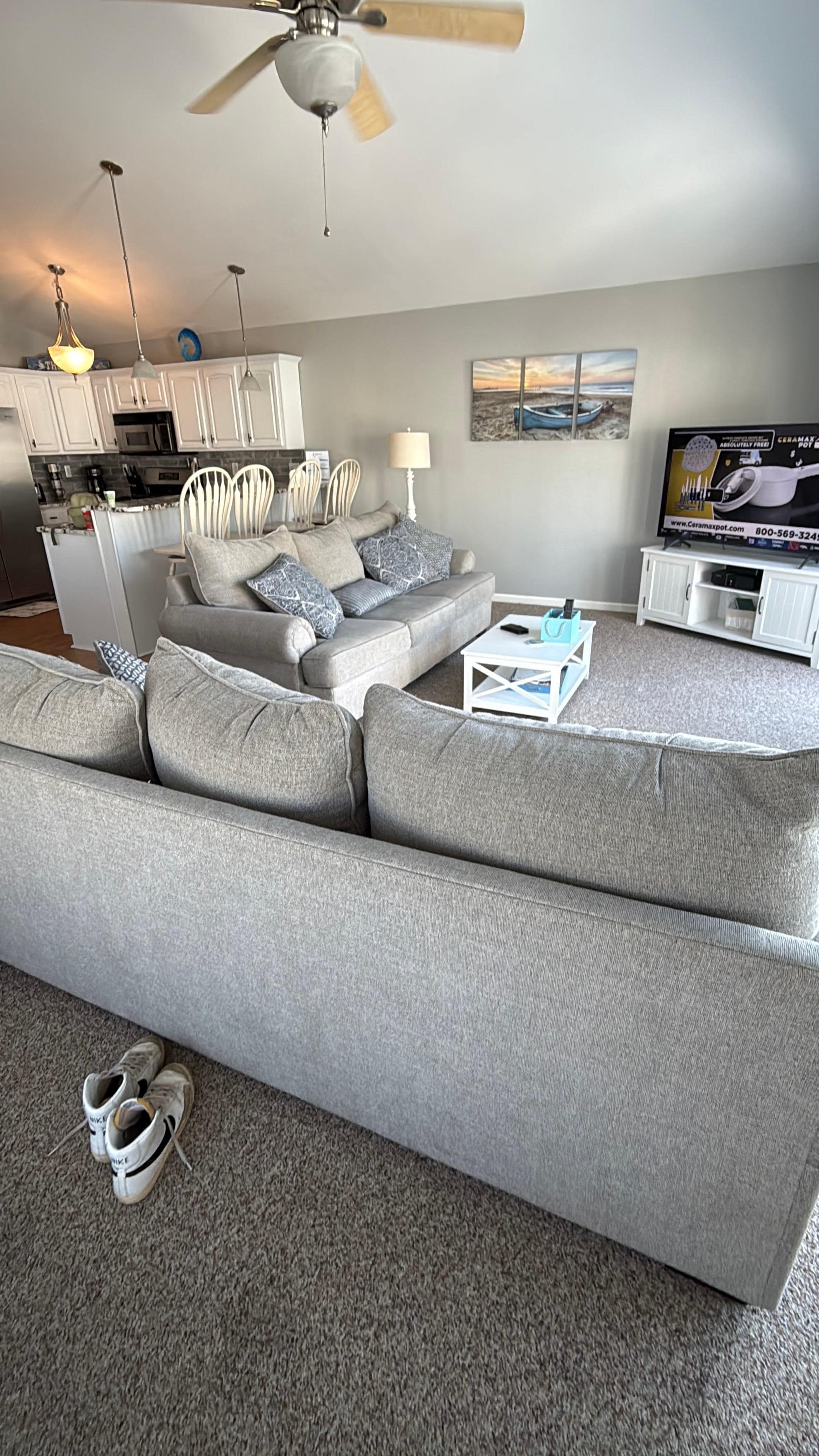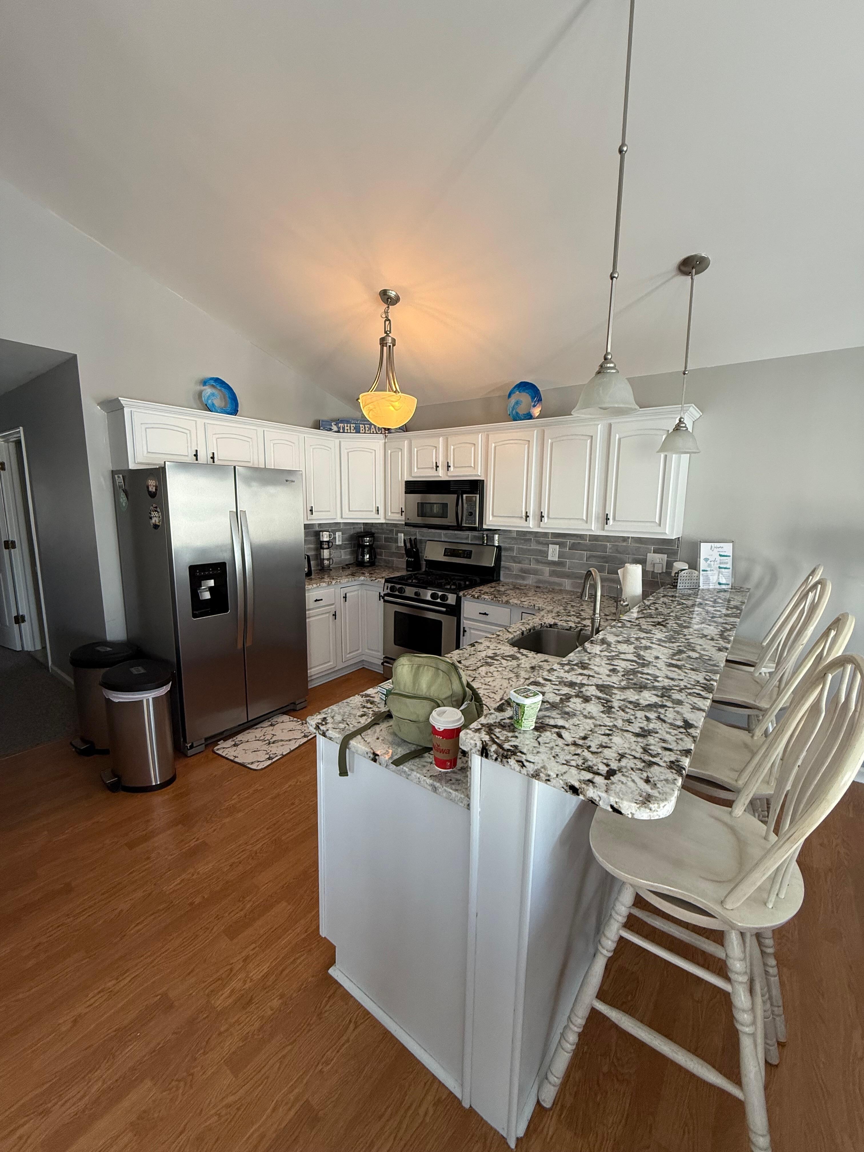 The kitchen area has a large dining table with 6 chairs and counter bar with 4 full chairs. It comes fully equipped with all pots, pans, drinkware, dinnerware, coffee maker, toaster, pack n play, iron, ironing board, hair dryer, Wii, XBox, DVD Player.
