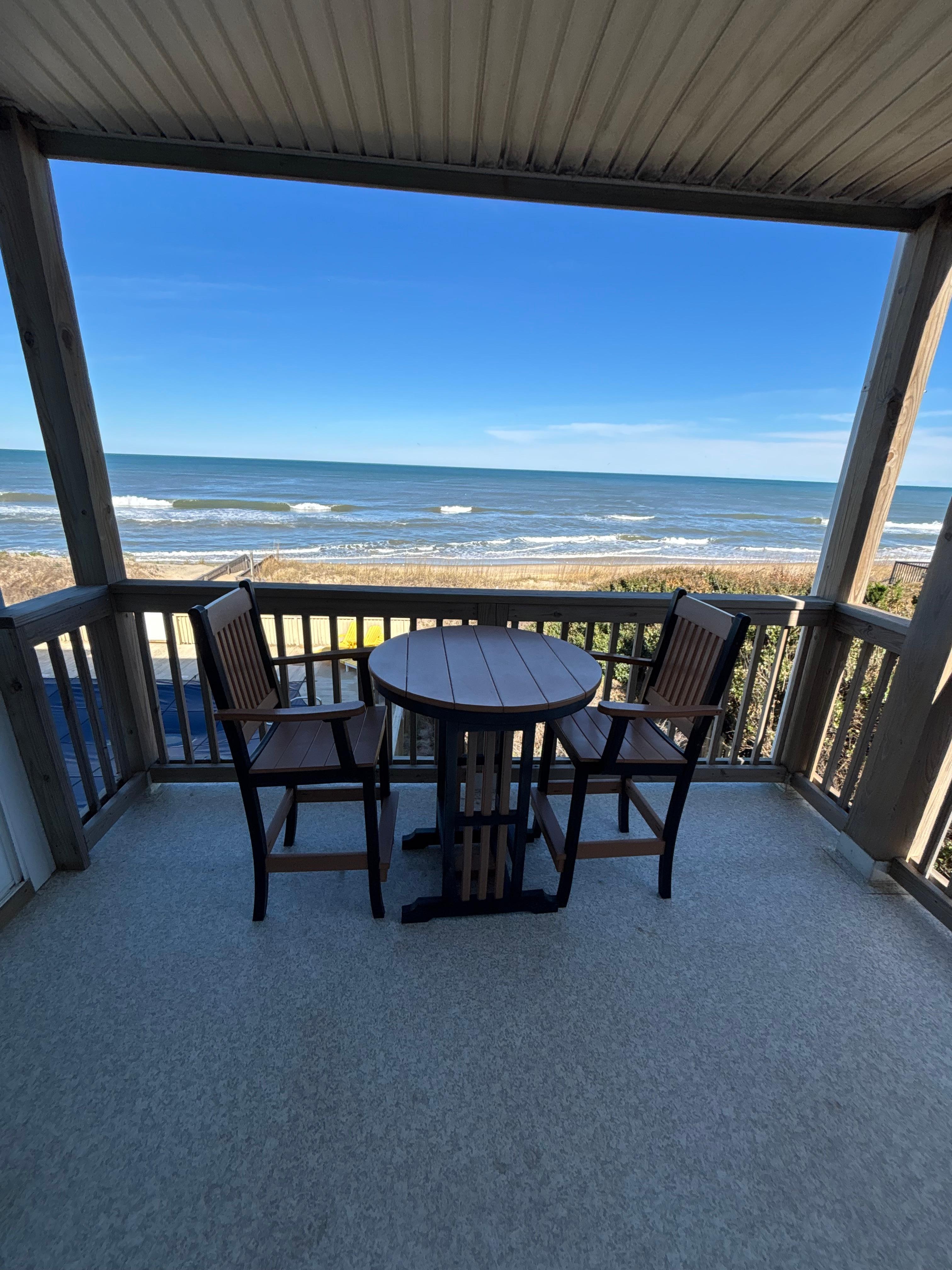 Awake in the soothing King suite, with sliding glass doors out to the oceanfront deck, complete with a hightop polywood table, perfect for sipping a morning coffee while you watch the sunrise. Take a moment before you start your day to admire Mother Nature's creation ☼. The second bedroom features a duo bunk, single twin bed, and smart TV. Two full baths provide an extra measure of privacy for guests.