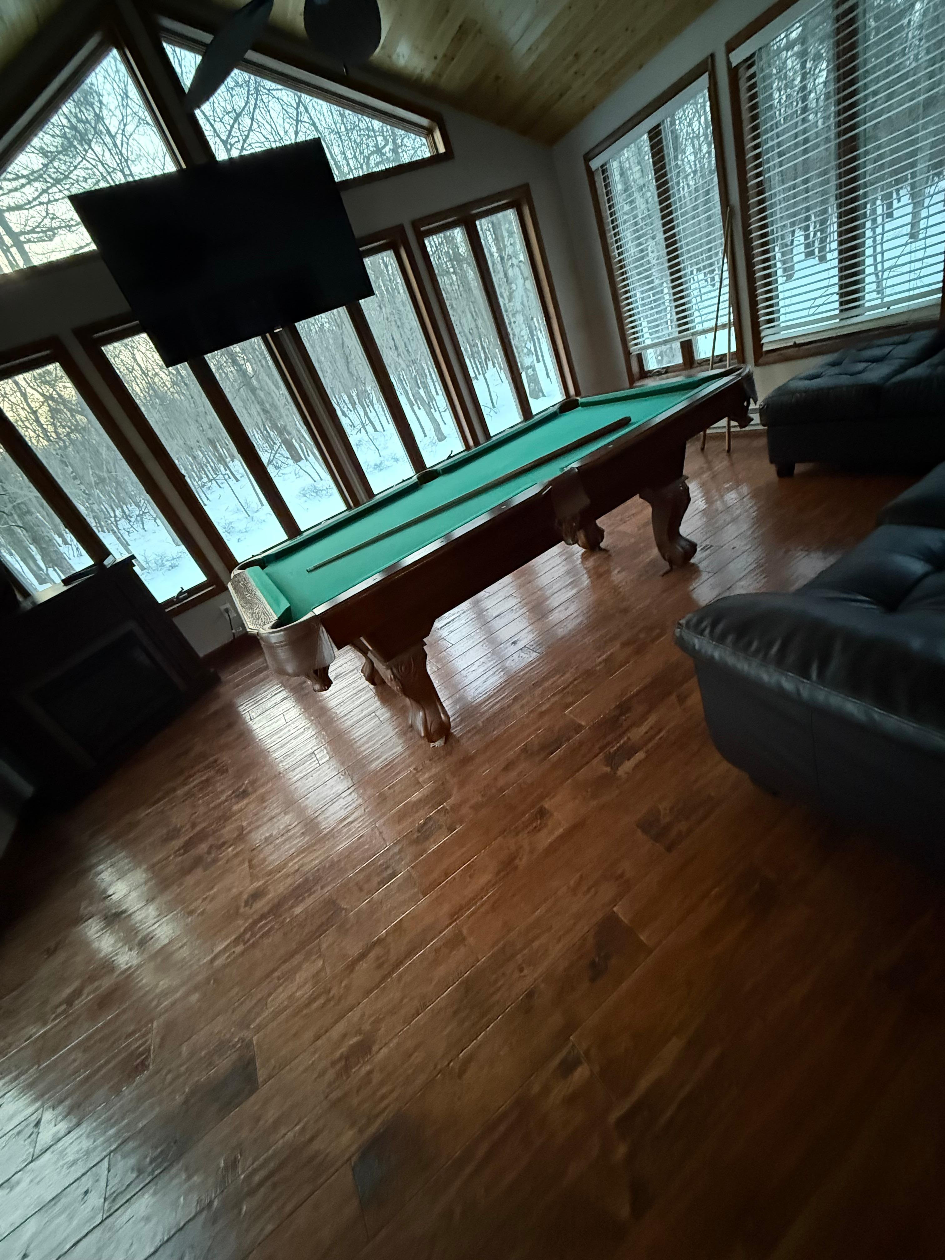*Game room offers pool table, sectional sofa, 65” Smart TV, fireplace, lovely views of the woods, and access to the deck