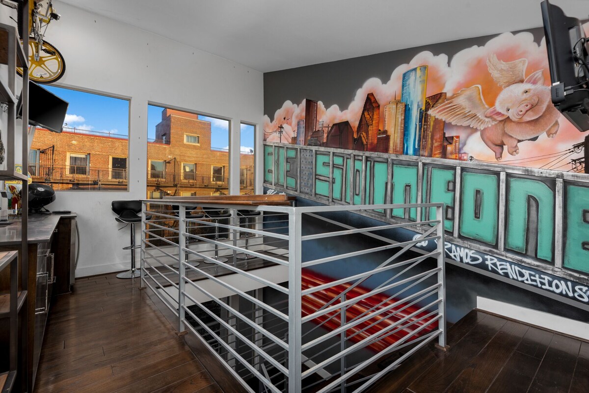 This gorgeous east downtown (EaDo) luxury townhome is located in the epicenter of downtown activity and is just blocks from Discovery Green, Minute Maid Park, The Toyota Center, BBVA Stadium, 8th Wonder Brewery, the GRB Convention Center and the thriving EaDo bar and restaurant scene. Boasting a rooftop deck with a bar, hot tub, fire pit and grill, our glam hideaway will show you the true meaning of our flying pig theme - that anything is possible if you can dream it up. The city is yours!