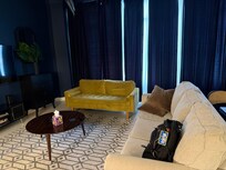 The bedroom? Let’s just say it’s what would happen if a luxury hotel and a backstage pass had a baby—wrapped in gold and brown satin, with low lighting and serious vibes. The plush sleeper sofa in the main living area gives you space for up to 4 guests total, with modern comforts like smart TVs, high-speed WiFi, and a full kitchen for when you’re not out exploring.