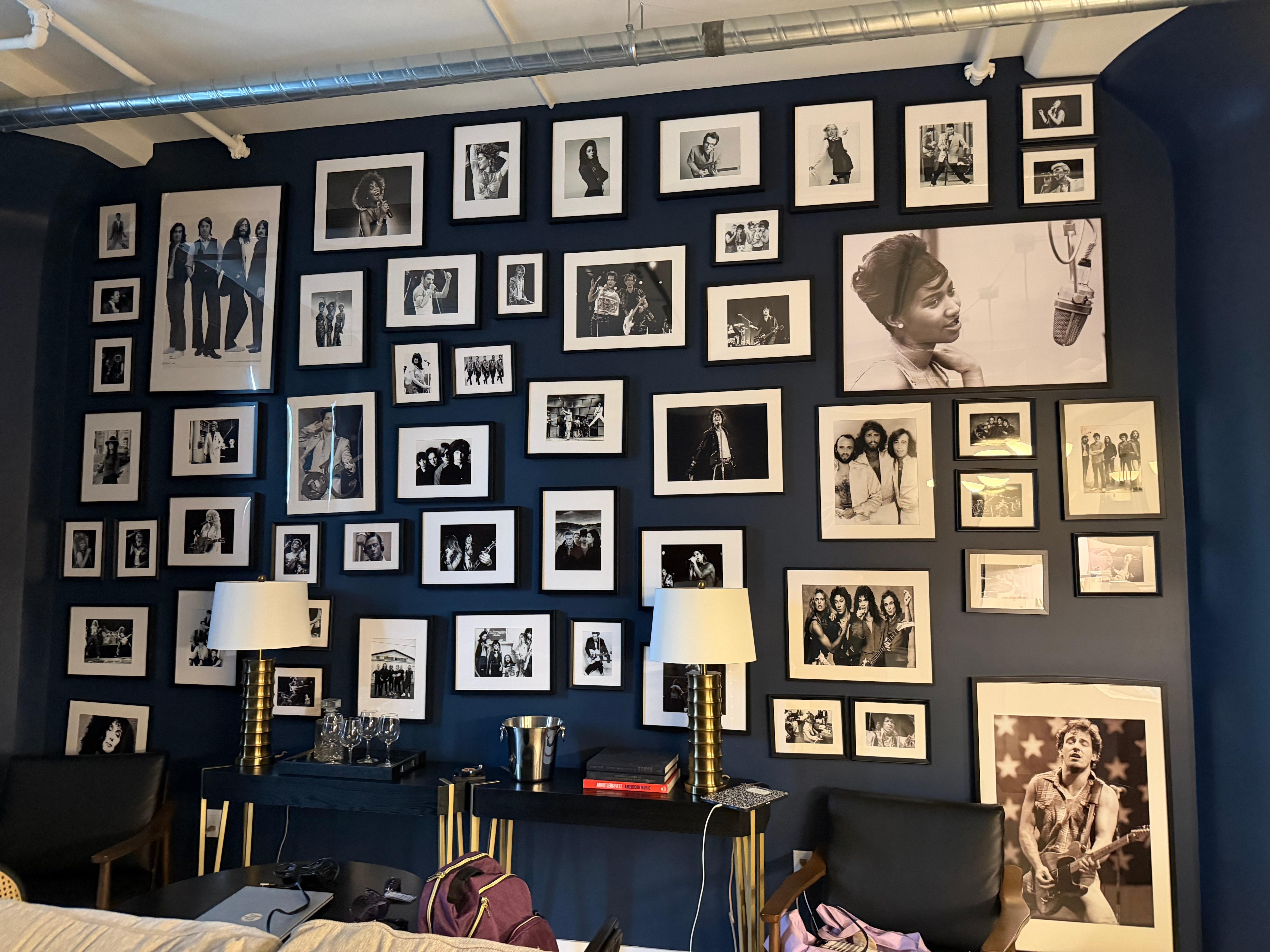 From the moment you walk in, you’re greeted by a wall-to-wall gallery of the greatest musicians in history—framed against rich navy blue walls and anchored by 12-foot curtains that scream drama, mood, and pure LA style.