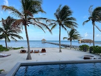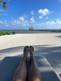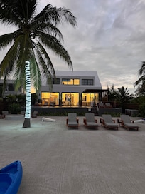 Wilson Point is a gorgeous beachfront home with everything to ensure you have a great island vacation: private pool, gym, beautiful well-stocked kitchen, huge ‘great room’, four bedrooms (each with en suite bath), housekeeping, kayaks, ping pong, fire pit, & more! Located in a residential area 3.5 miles south of San Pedro, you are close enough to town yet can have quiet, peaceful evenings at home. This is a great spot for families & low key vacations with friends.