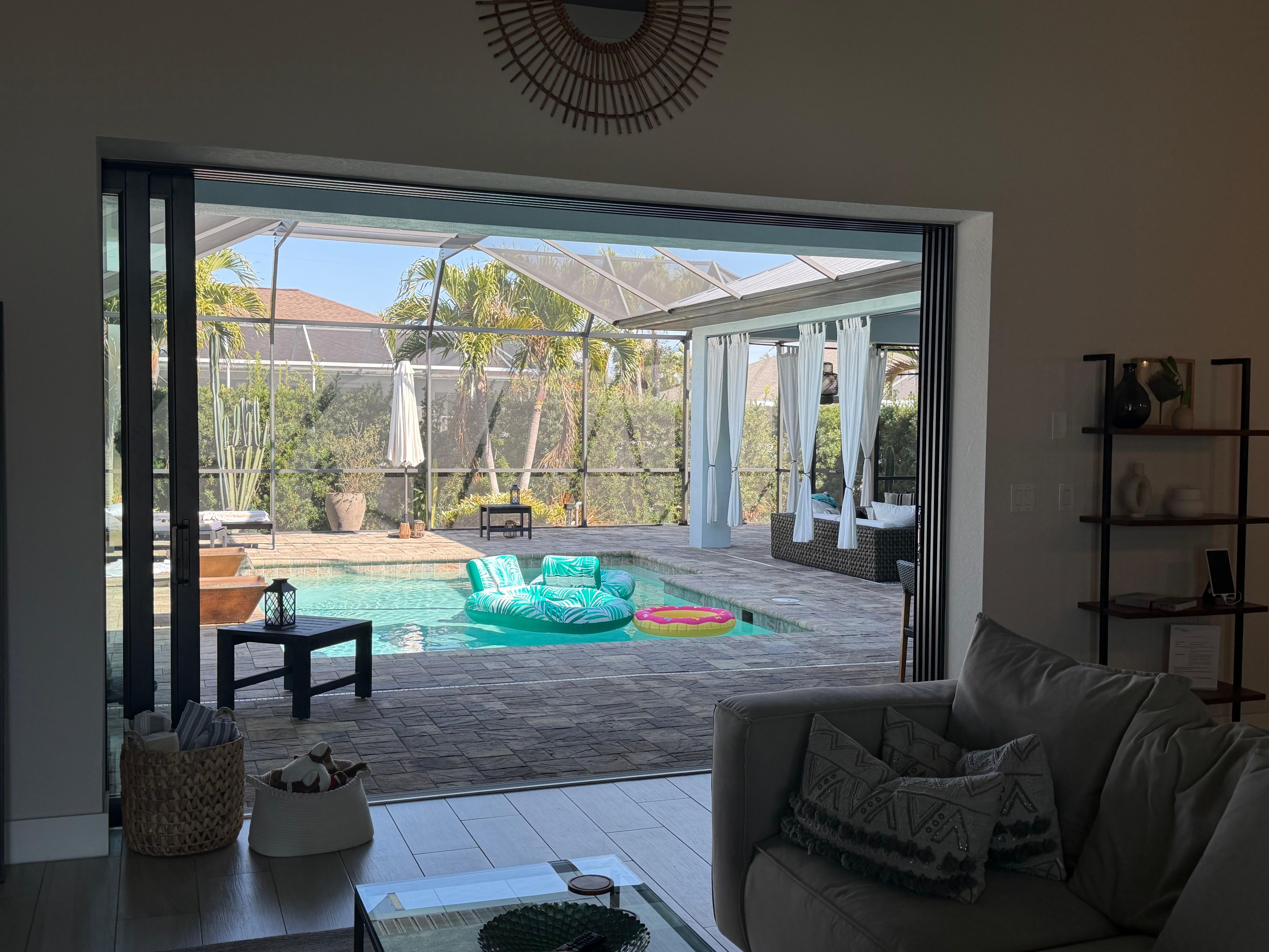 The floor plan of the home brings the outside in with large pocket sliders that open all the way up to your outdoor living space. The outdoor living space has been absolutely perfected for lounging, swimming, grilling, and entertaining. Totally private in the back, this spectacular property checks all of the boxes.