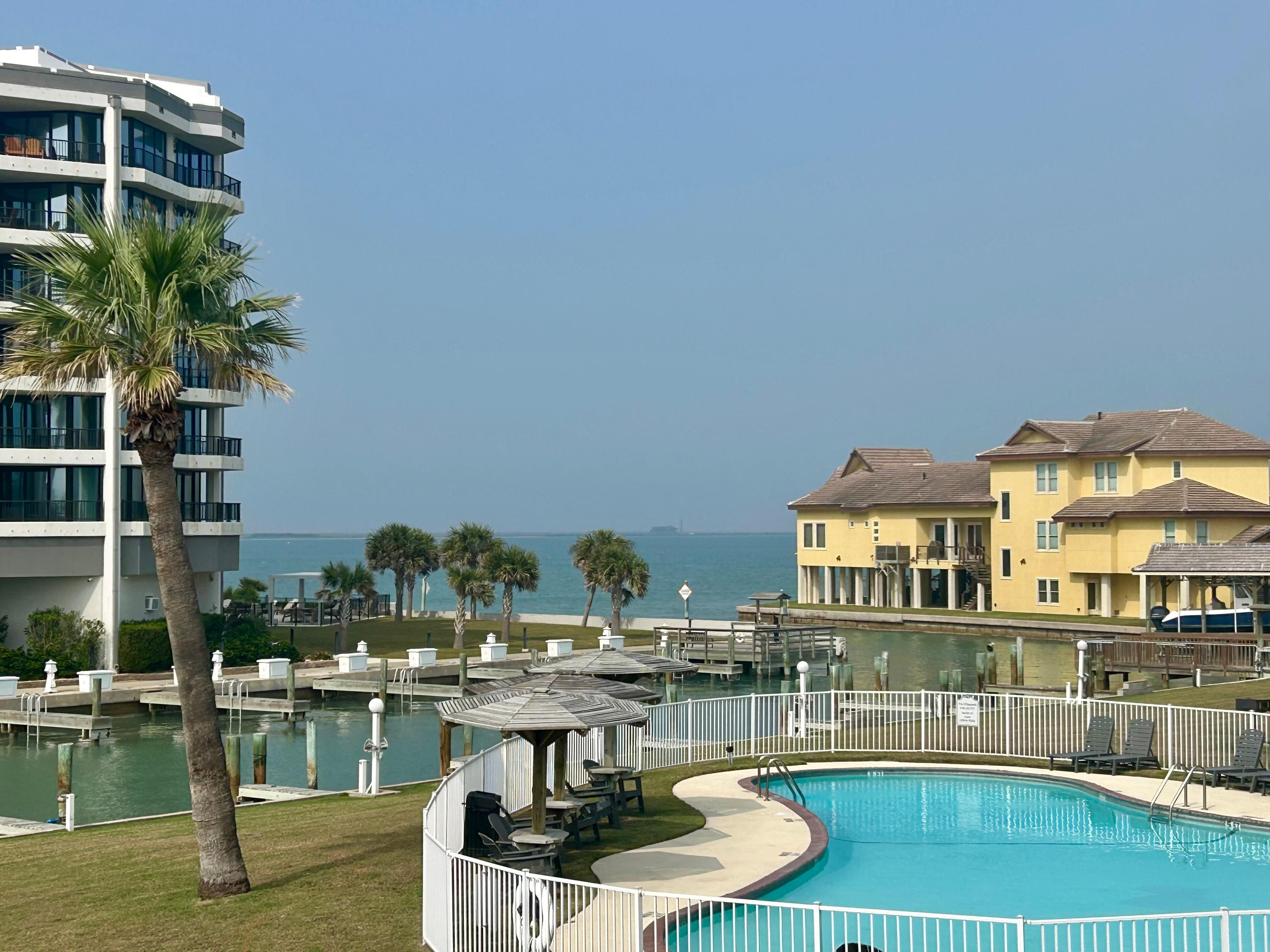 Bay Tree Condos B1516. Tastefully decorated Port Aransas condo, has 2 balconies and front stoop with seating to watch the ships pass by over looking the swimming pool, boat slips and private fishing pier. This condo is located on the second floor with no elevator access. Tile floors, stainless appliances, comfy sofa sleeper in the living area. One full restroom on each floor. All bedrooms on 3rd floor. Interior connected by spiral staircase. Close to restaurants, fishing, beach, and night life. Sorry, no pets allowed as of 6/13/24. Parking for 2 vehicles. Boat slips for rent at an additional cost of $45.00 + tax per night. It is first come, first serve. Please request at the time of booking