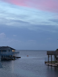 (Now with a new pool !!) Come relax with the whole family and enjoy the "perch" that is the envy of the neighborhood! With an unobstructed panoramic view of the bay from two private balconies facing the western sunset, along with two decks overlooking the east side with one of the widest, most pristine canals in the area, you will toast the sunset each evening and enjoy the best fishing and crabbing outside your backdoor from morning to night. Soak up the sun on the spacious decks or play games in the shade on the lower patio where the bay breezes will keep you cool. A grill and downstairs beverage refrigerator are conveniently available for your use. There is a swim ladder for access to the canal, a covered boat dock for tethering your boat or water toys, and two crab traps to get the fishing started.