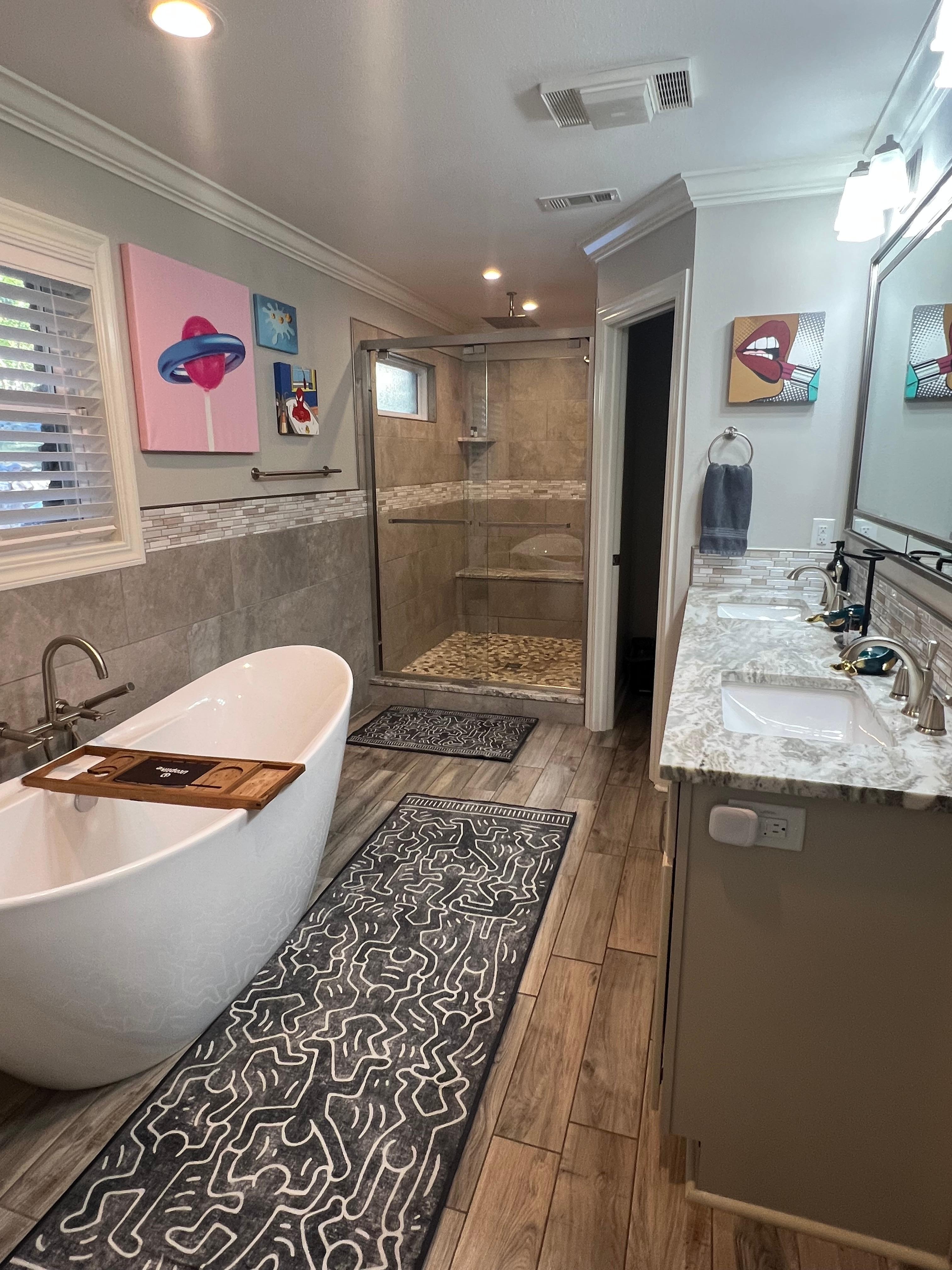 - Primary Bedroom (Pop is King): King Bed, Desk with Monitor, 50” Smart TV, Ensuite Bathroom with Soaking Tub and Rain Shower