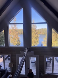 Mezzanine: Two large, bright bedrooms and a full bathroom. One of the bedrooms has a queen sized bed with scenic lake views.
