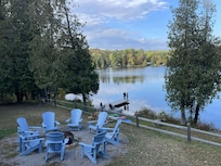 This 4 acre property features the main cottage and the `bunkie,` a self-sufficient mini apartment with its own living and dining space, two bedrooms, a full bathroom, and a fully equipped kitchenette. Perfect for extended family or those seeking extra privacy, the bunkie is situated above the garage next to the main cottage. Both offer stunning lake views.