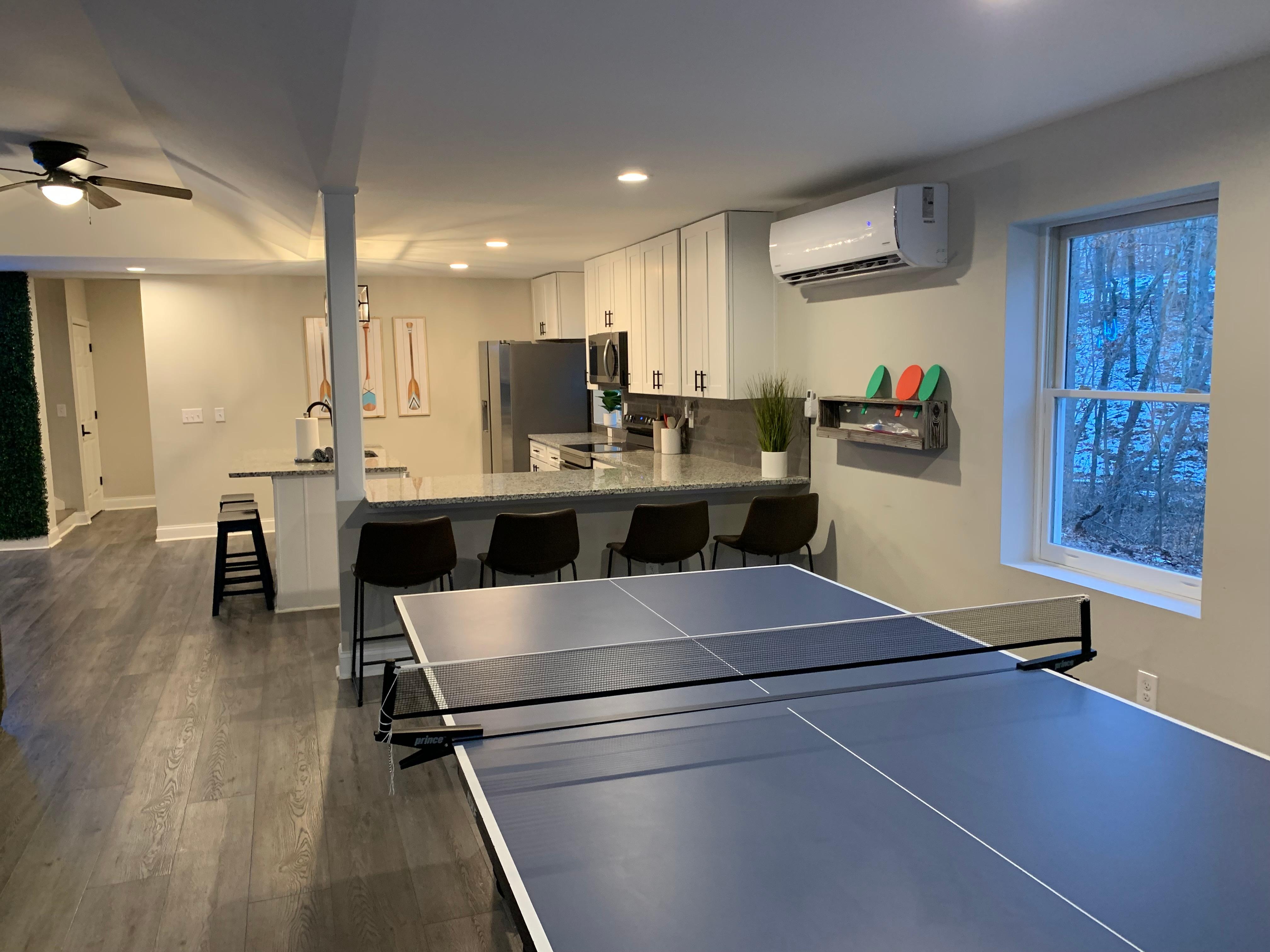 Downstairs is where the kids will want to call home. A fun and cozy bunk room sleeps six with three twin-over-twin bunk beds, offering the perfect setting for late-night giggles and early-morning excitement. Just outside the bunk room, the game room brings everyone together with a ping pong table, a big-screen TV, and a comfy sectional to watch movies or cheer on your favorite team. There’s also a convenient kitchenette with dual islands, barstools, and a bar-height dining table for casual snacks and hangouts.