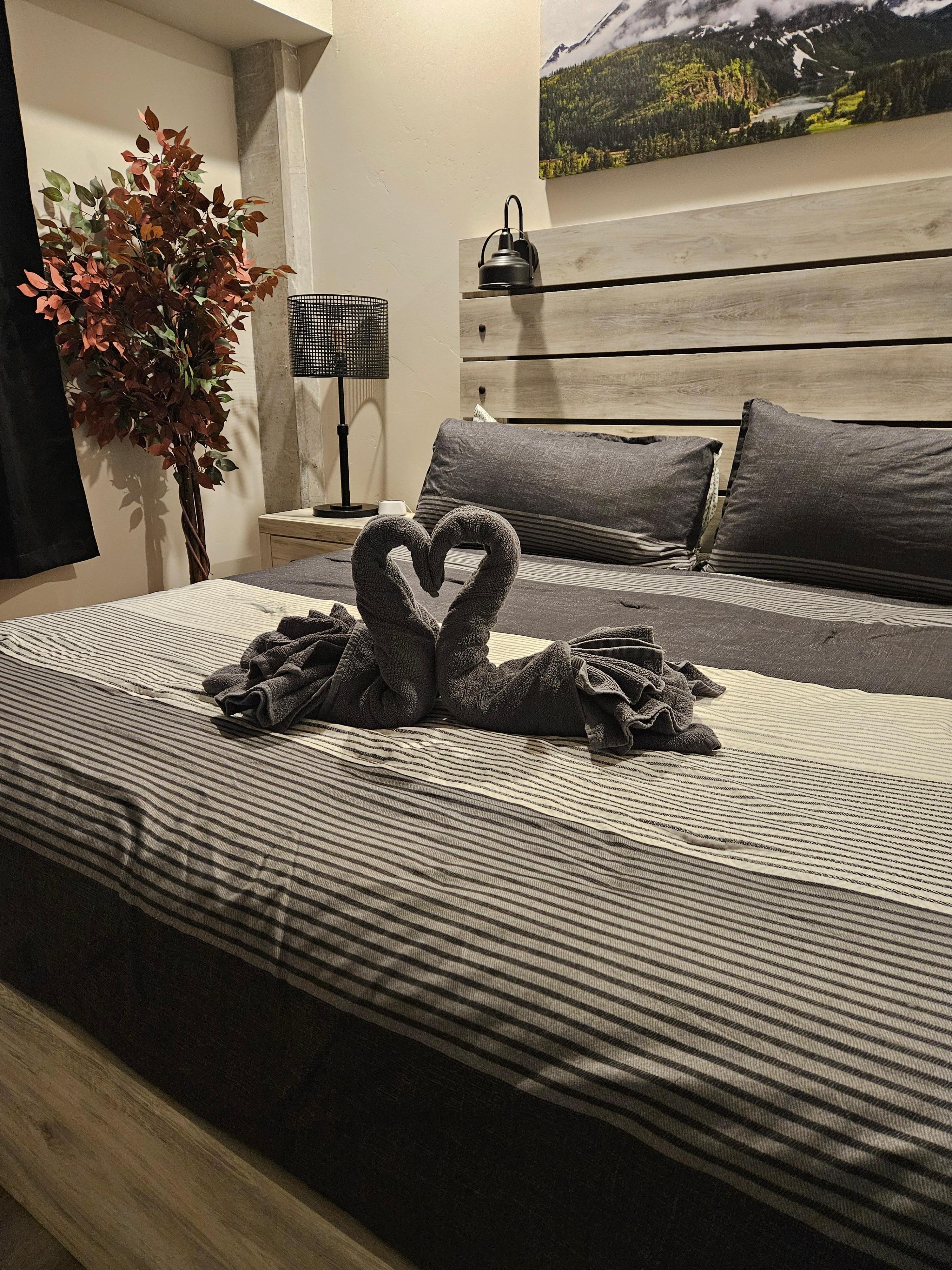This cozy retreat features a comfortable living room with a queen sofa bed, an office/den equipped with full-size bunk beds, and a single bedroom with a luxurious king-size bed. Enjoy all the modern comforts, including WiFi, a fully equipped kitchen, a washing machine, and essentials like a coffee maker, toaster oven, and blender. Stay warm with the efficient heating system, and unwind with entertainment options on the 65” TV in the living room and the 43” TV in the bedroom. Experience restful nights with down feather pillows, all beds and pillows have protectors that are laundered between guests.