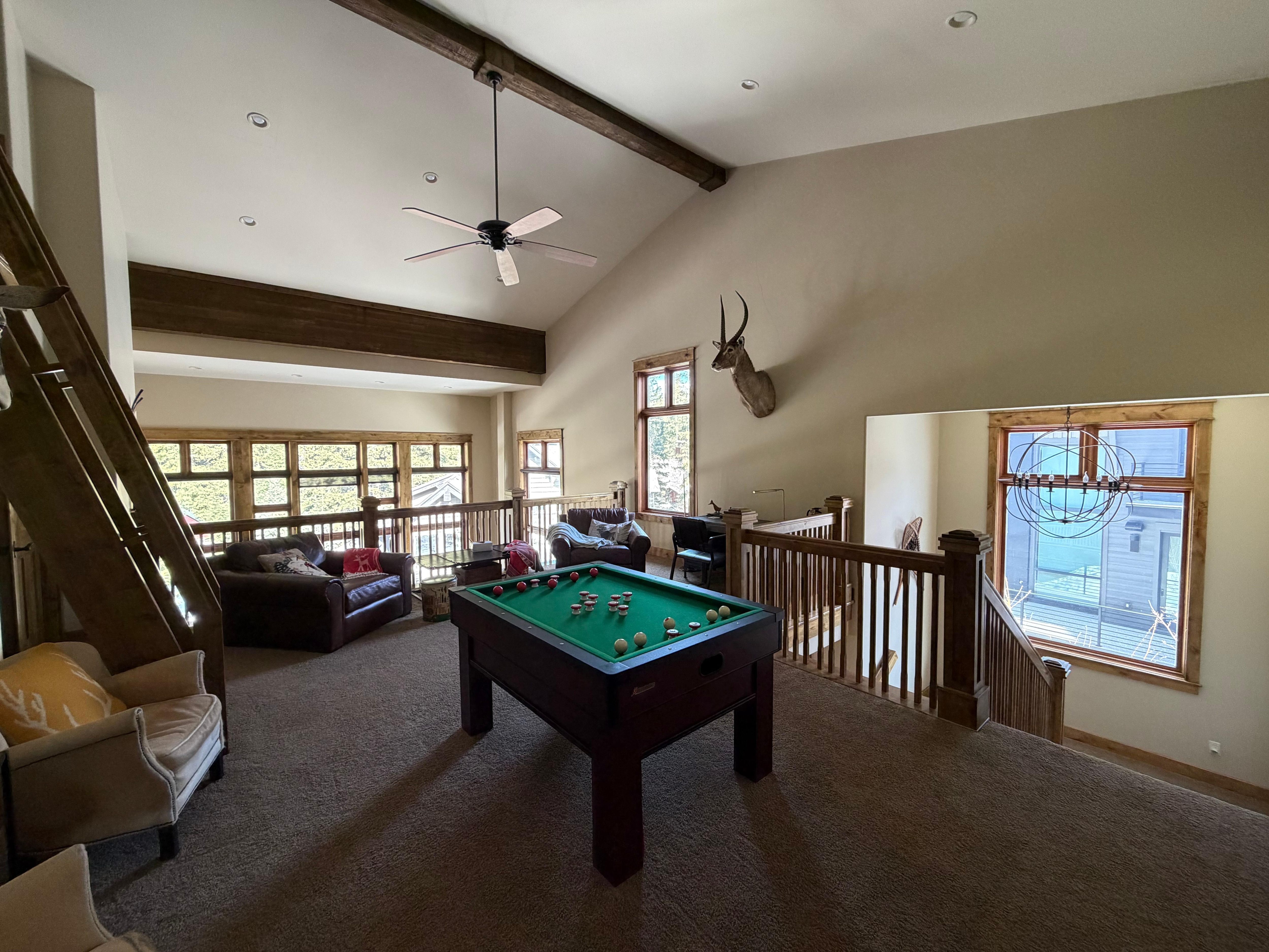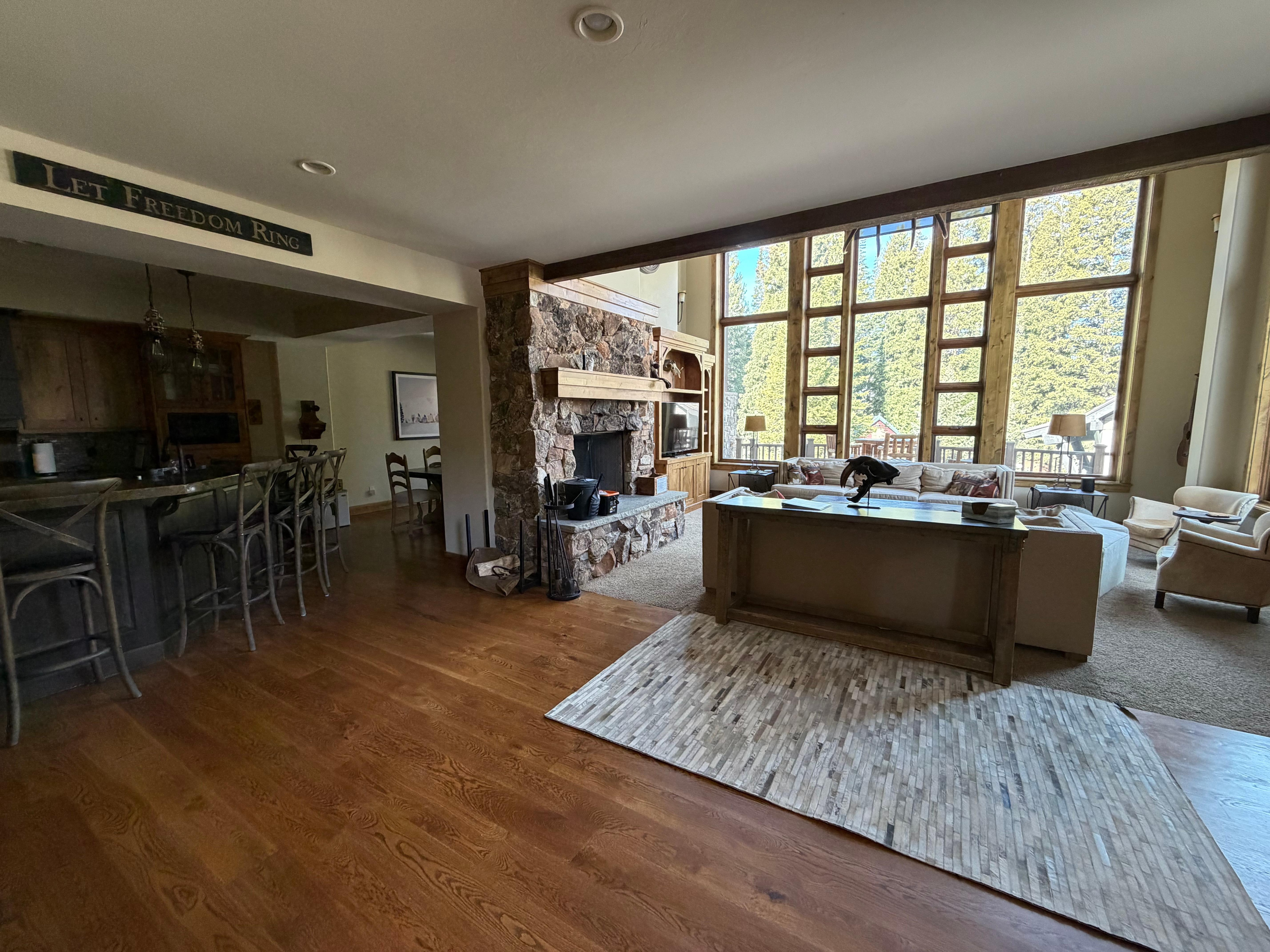 The expansive layout features a bright, open great room with soaring windows that showcase breathtaking mountain views. After a day on the slopes or trails, unwind by the wood-burning fireplace, designed with ample seating for everyone to relax together, or gather in the inviting upstairs family room.