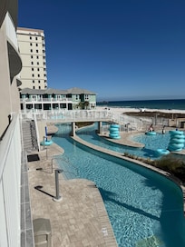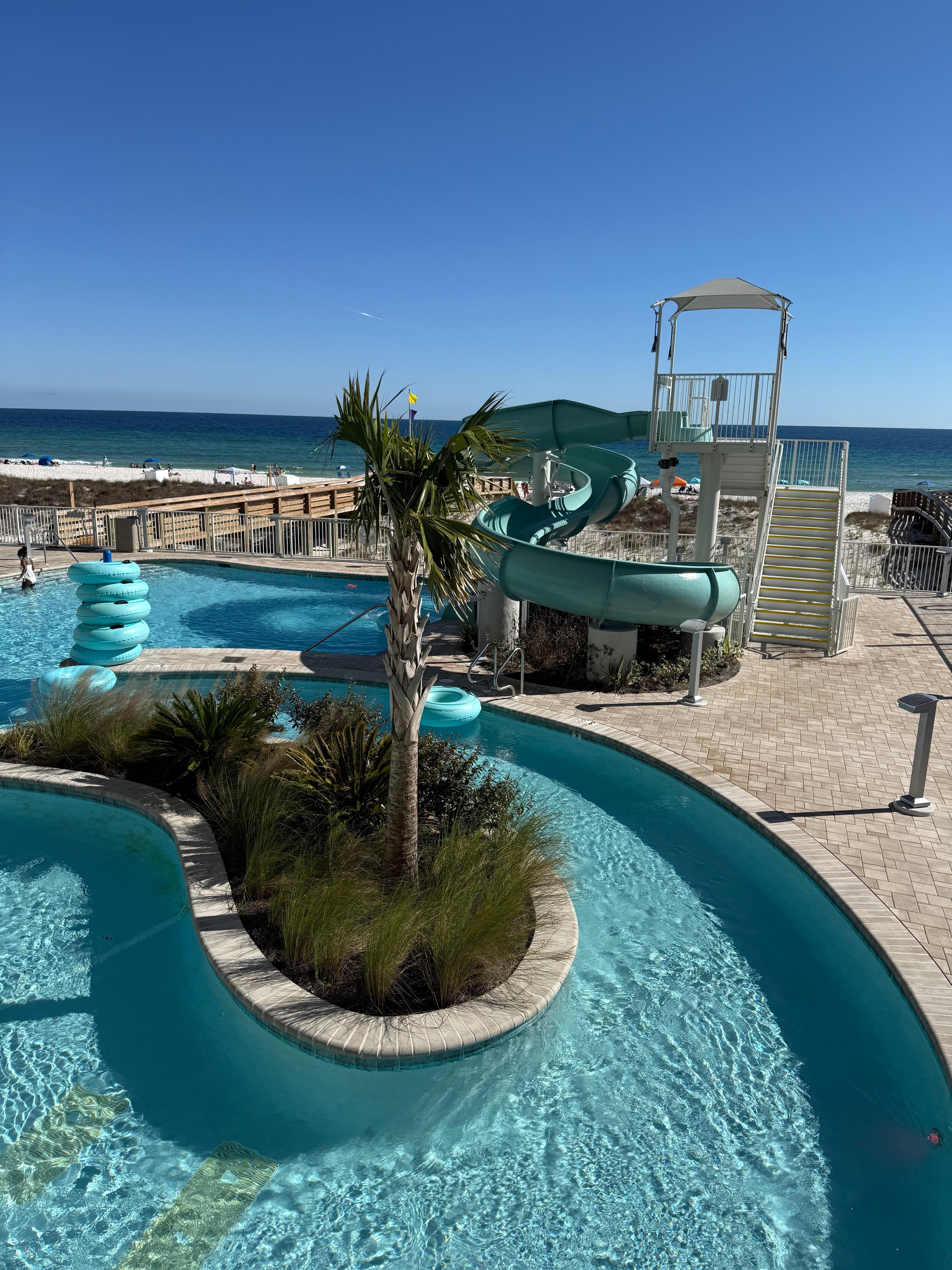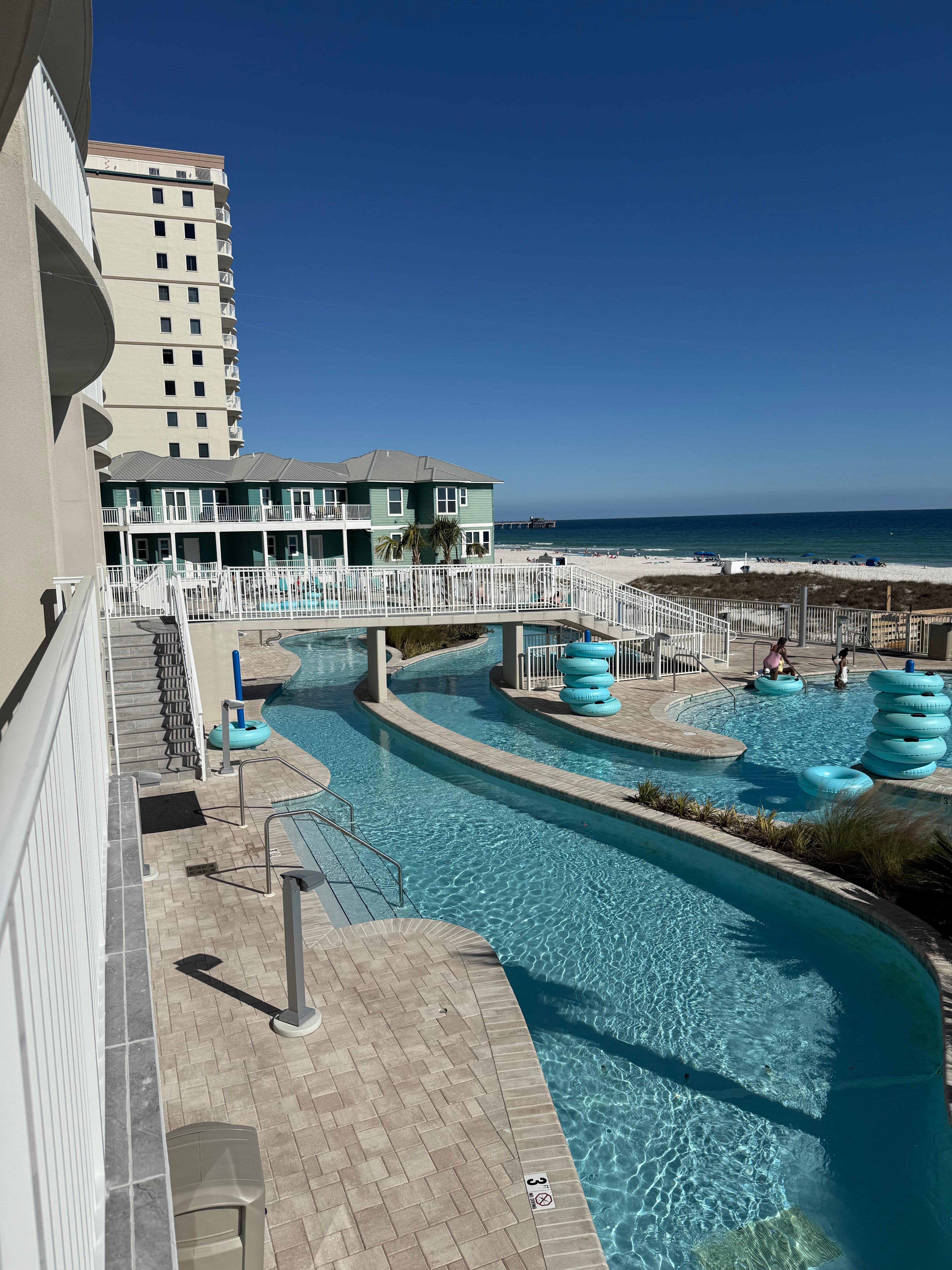 Brand New property with Lazy River in Gulf Shores. Features 1 king bed, 4 queen beds, and 2 bunk beds, perfect for families (up to 12). With 3 full bathrooms including a jetted bathtub, guests can relax and unwind after a day of exploring. Enjoy the welcoming atmosphere of this condo, complete with AC, WIFI, Games & puzzles and spices in the kitchen! A fitness room is just off from the main lobby. All TV's are 70-75".