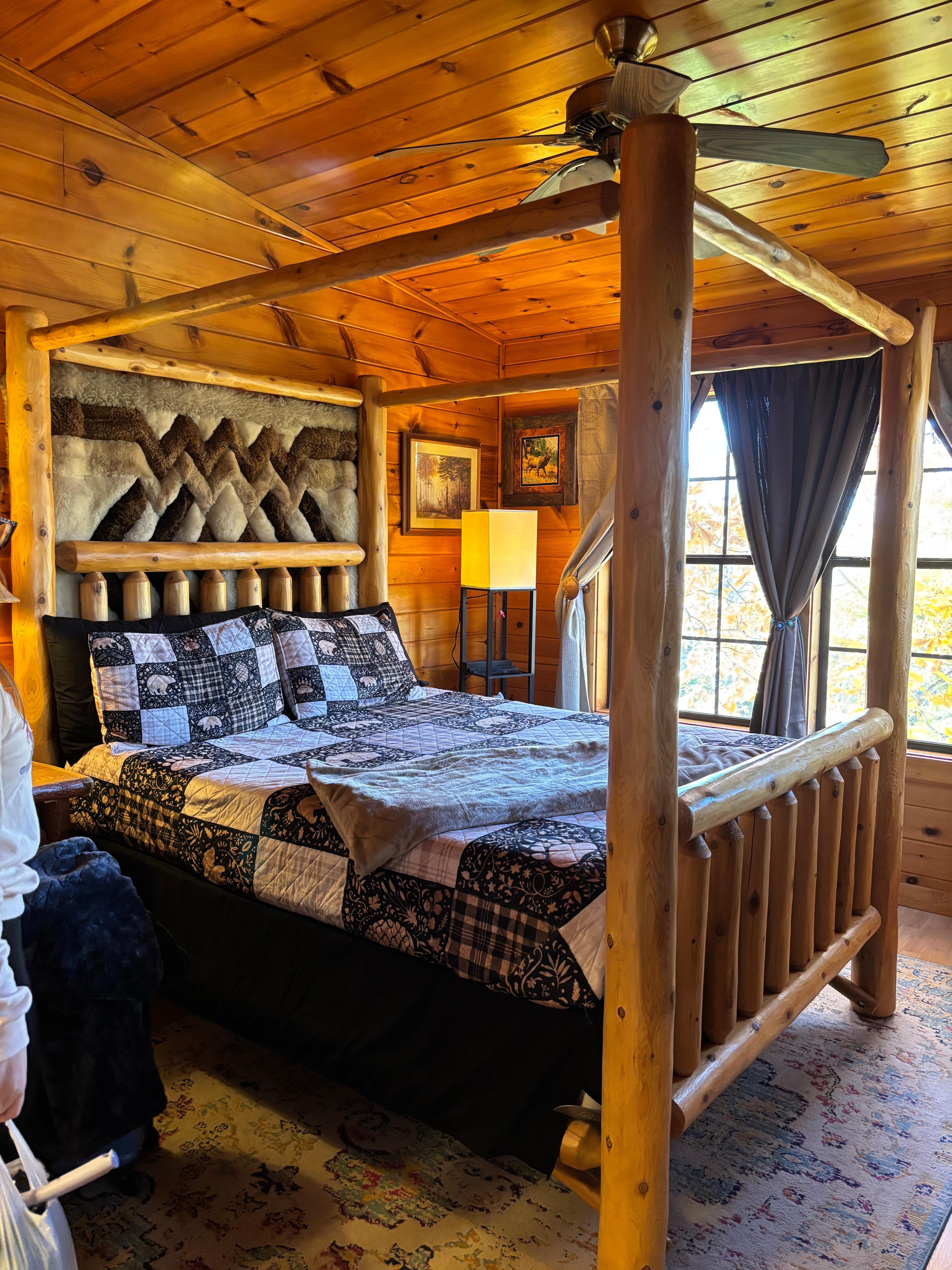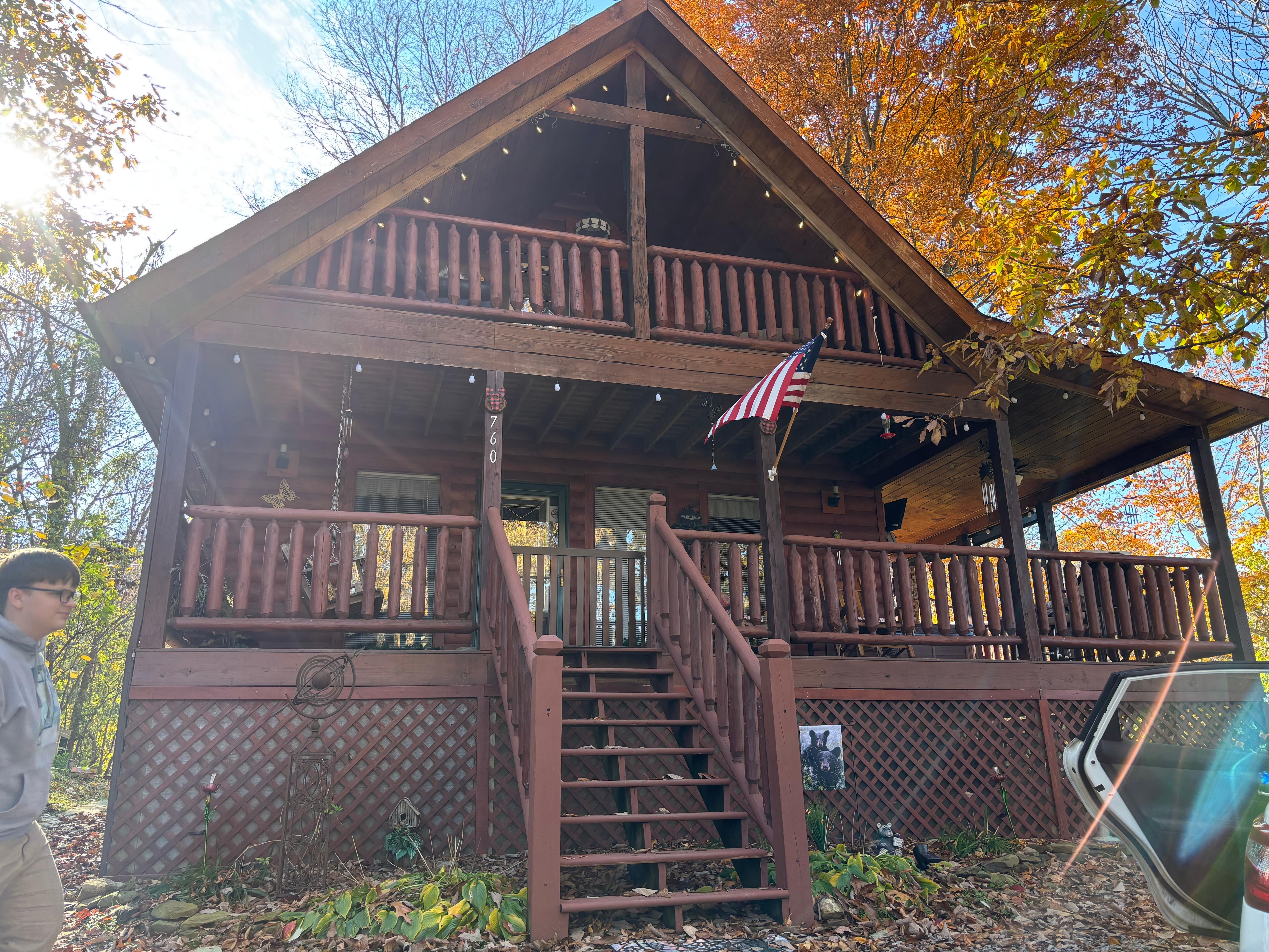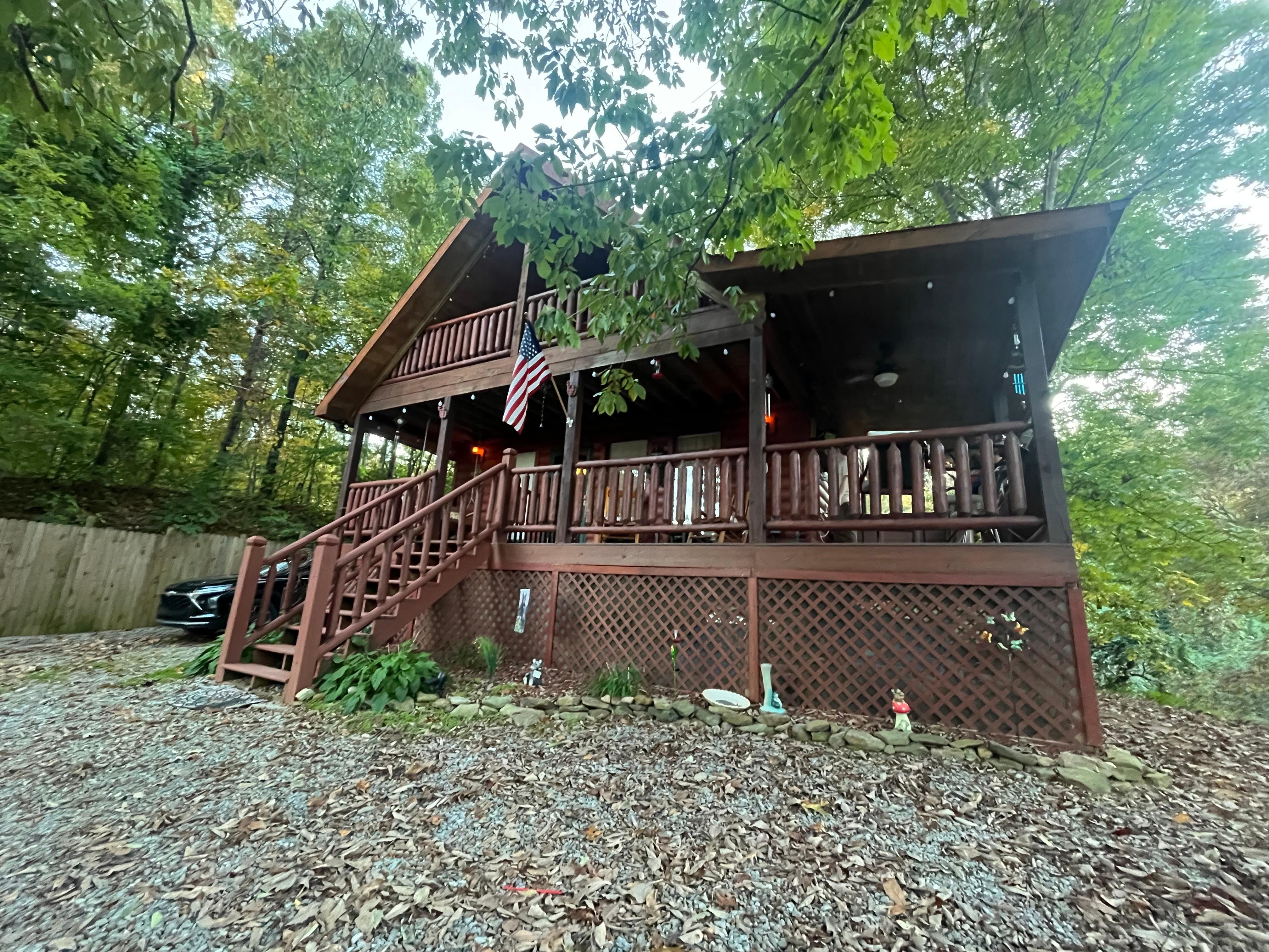 Located in Sevierville, enjoy what this adorable 2-bedroom cabin has to offer. With 2 queen beds, 2 bathrooms featuring a shower and jetted bathtub, and a cozy living room with a sofa bed, our place will help you feel at home. Enjoy the hot tub after a long day of play. Make dinner in the fully stocked kitchen or just rock away in the rocking chairs on the front porch.