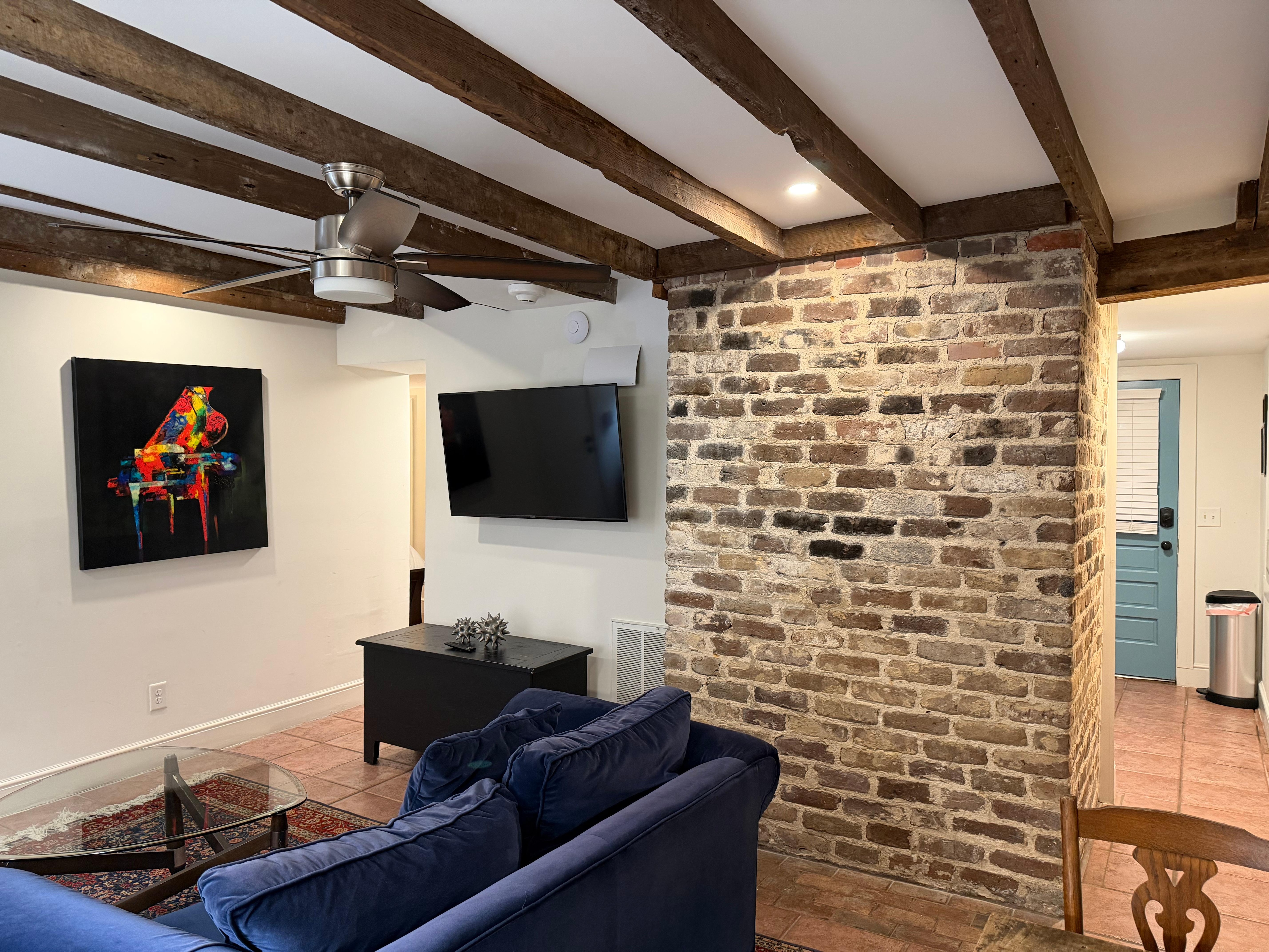 This charming 1-bed/1-bath retreat sits on the ground floor of an 1850s farmhouse, thoughtfully renovated to showcase heart-pine ceiling joists and the original brick chimney. A curated blend of antiques and modern comforts creates a warm, inviting atmosphere. Nestled in the heart of downtown near bustling Upper King Street, it includes convenient onsite parking. From history and shopping to fine dining and nightlife, Charleston’s best is just steps away.