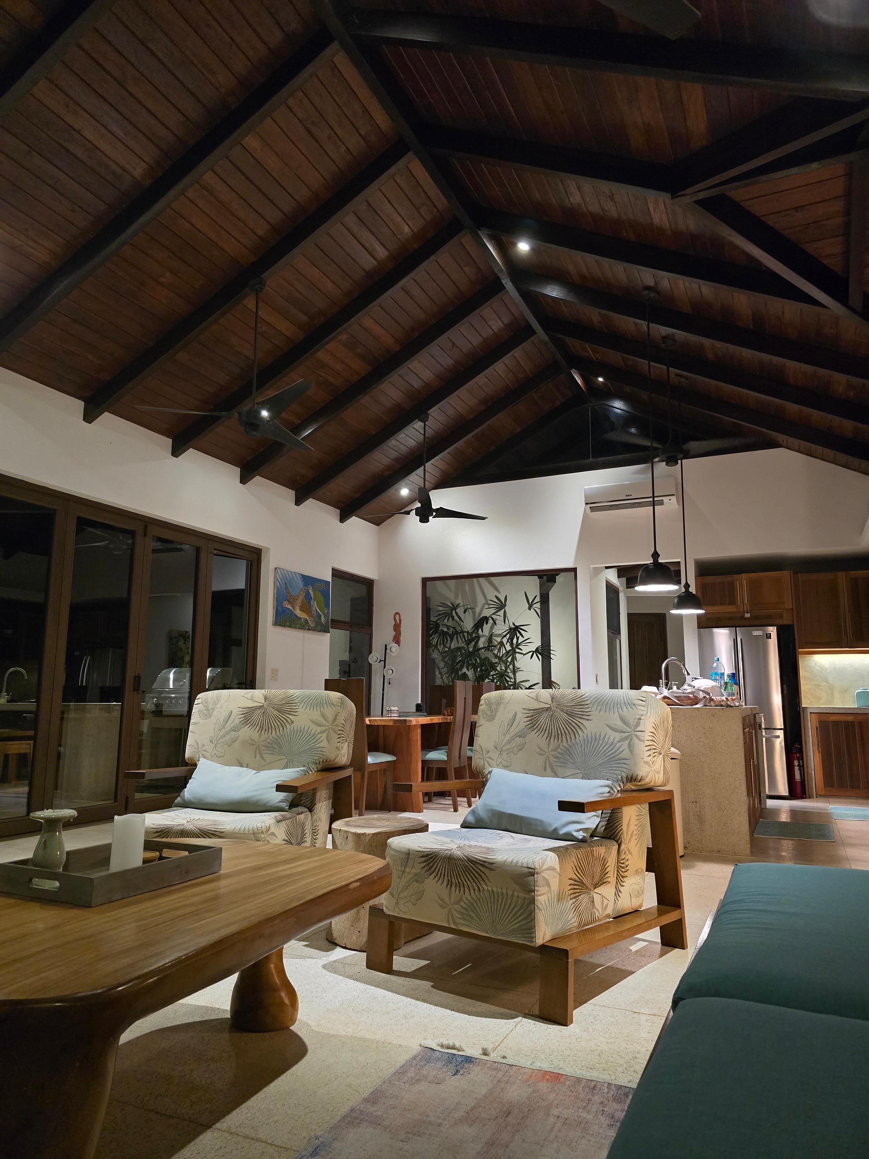 This luxurious home merges the new with the old. The kitchen is fully equipped with new GE profile appliances and all the amenities of home. The structure is cement with cement floors and teak ceilings. All the furniture was handcrafted by local artisans with fine quality wood of Guanacaste and teak. The resort style 40 foot swimming pool is amazing overlooking the canopy and the ocean.