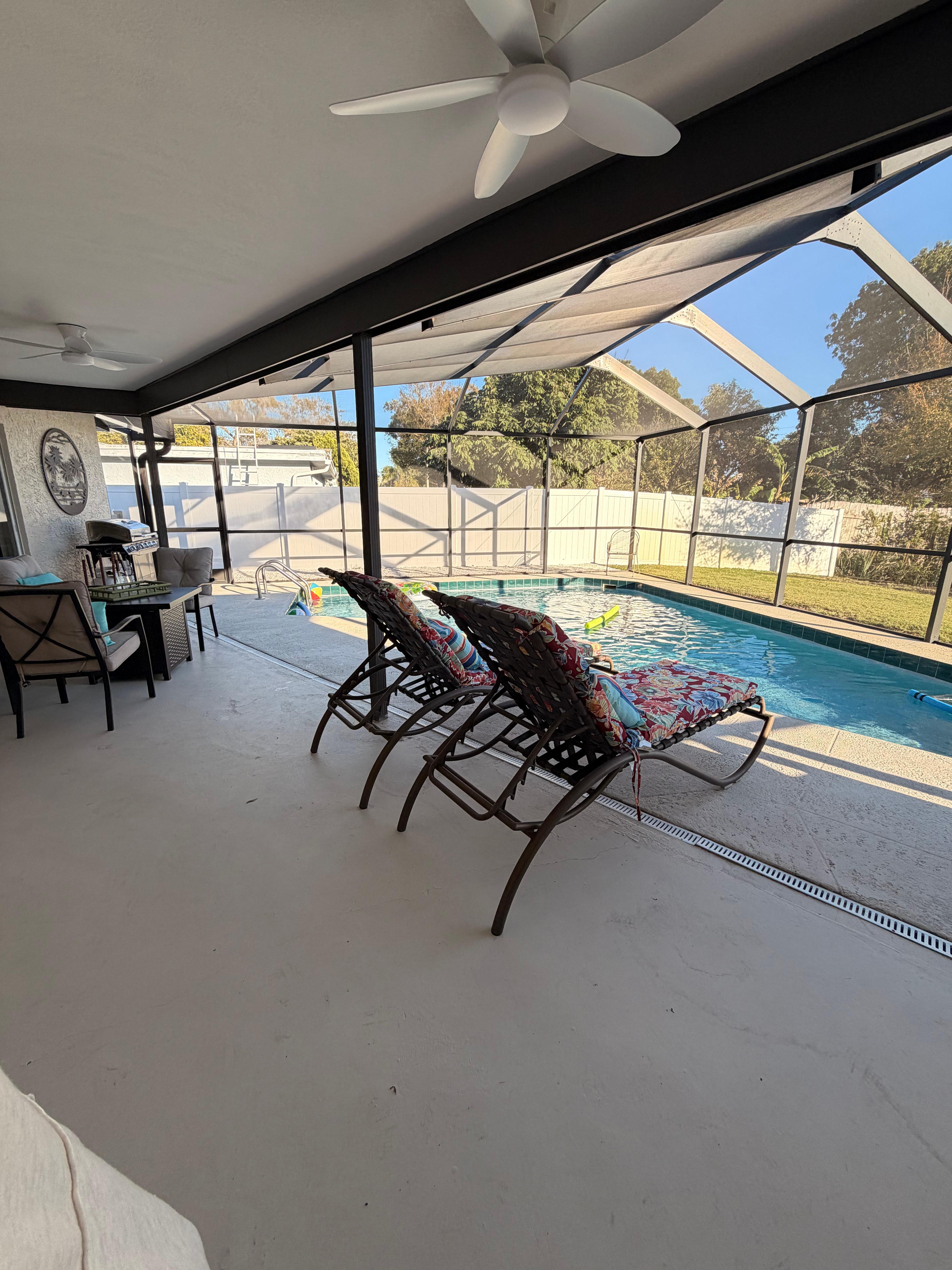 - Private screened-in heated pool (pool service included)
