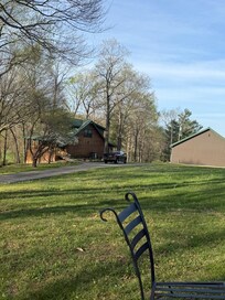 Come and enjoy the serenity and beauty of this authentic log home built by the Yorks' in 1997. Cabin on the Hill” features hand hewn square logs, hand carved cedar railings and large porches with much character and authenticity nestled in the woods for a quiet and peaceful stay. Enjoy the natural beauty of Reynolds Creek, birds, squirrels and other wildlife from the large bay window breakfast area. Breakfast dining also available on the screened in back porch.